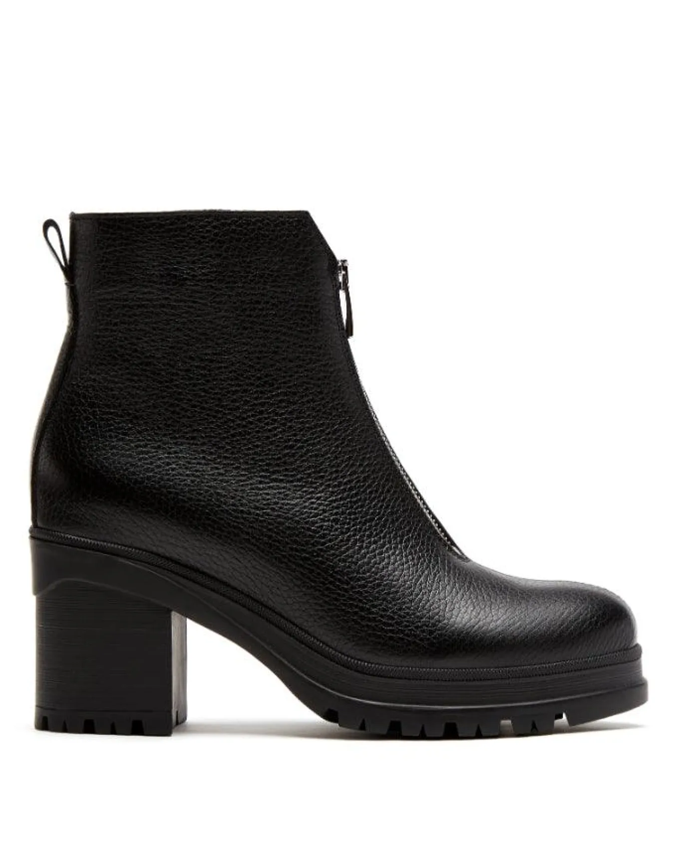 La Canadienne sleek pebbled calf leather ankle boot with front zipper closure, round toe, breathable microfiber lining, memory foam insole with a cushioned memory foam heel pad, flexible TPR (thermoplastic rubber) sole provides traction on wet surfaces and 3″ lug rubber block heel with 1″ platform.