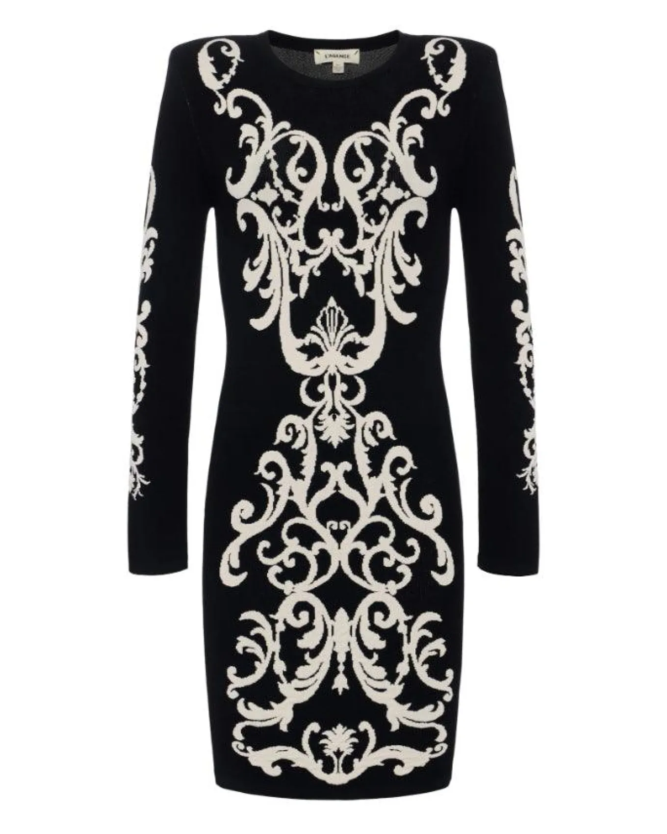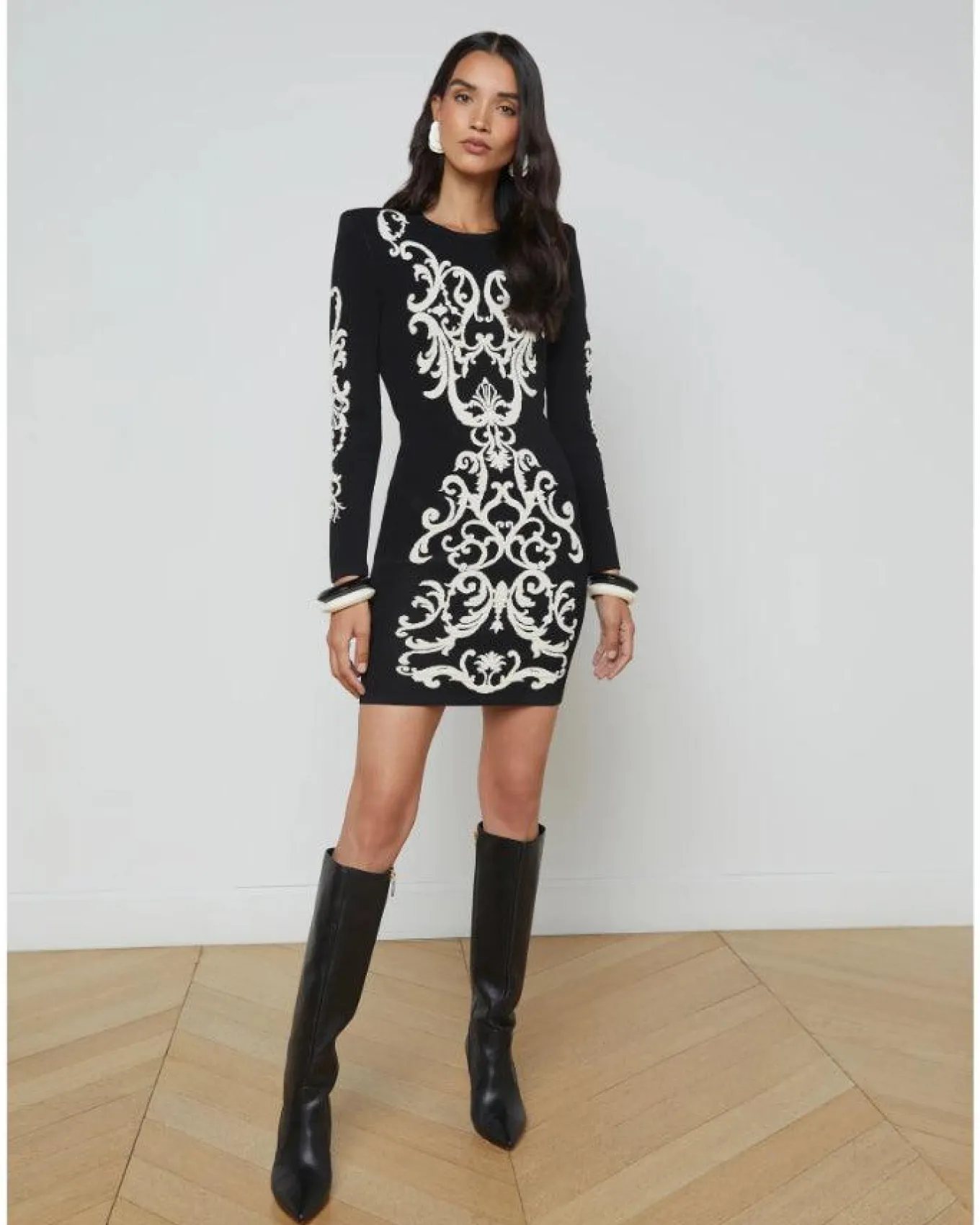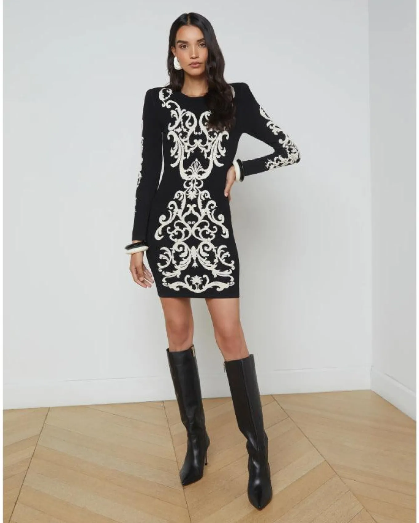 L’Agence striking bold knitted-in pattern mini dress features long sleeves with exaggerated shoulders, slim fit pullover style. Size XS – Length 33.6″, Sleeve Length 23.3″.