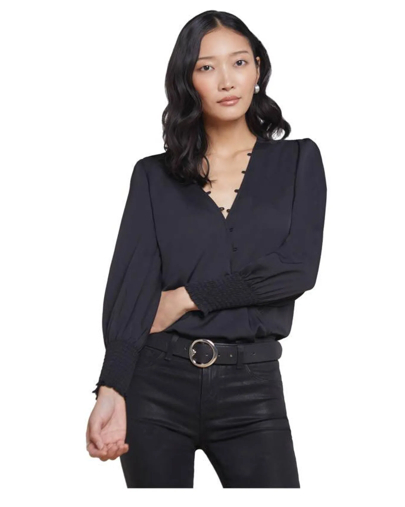 L’Agence lightweight non-stretch crepe blouse features crossover v-neckline with button snap at front and button loop accents, long blouson sleeves with smocked elastic cuffs, and high-low hem.