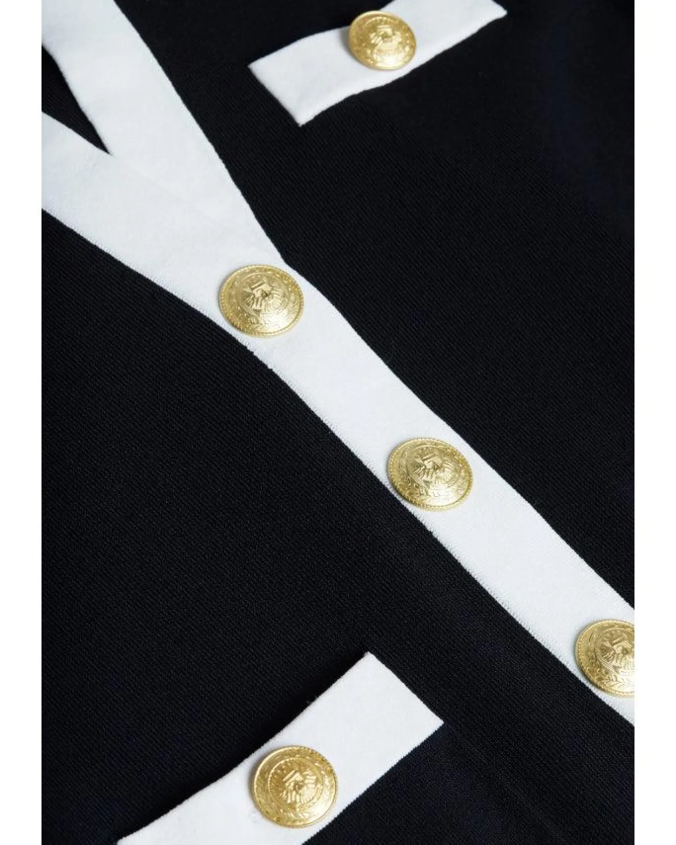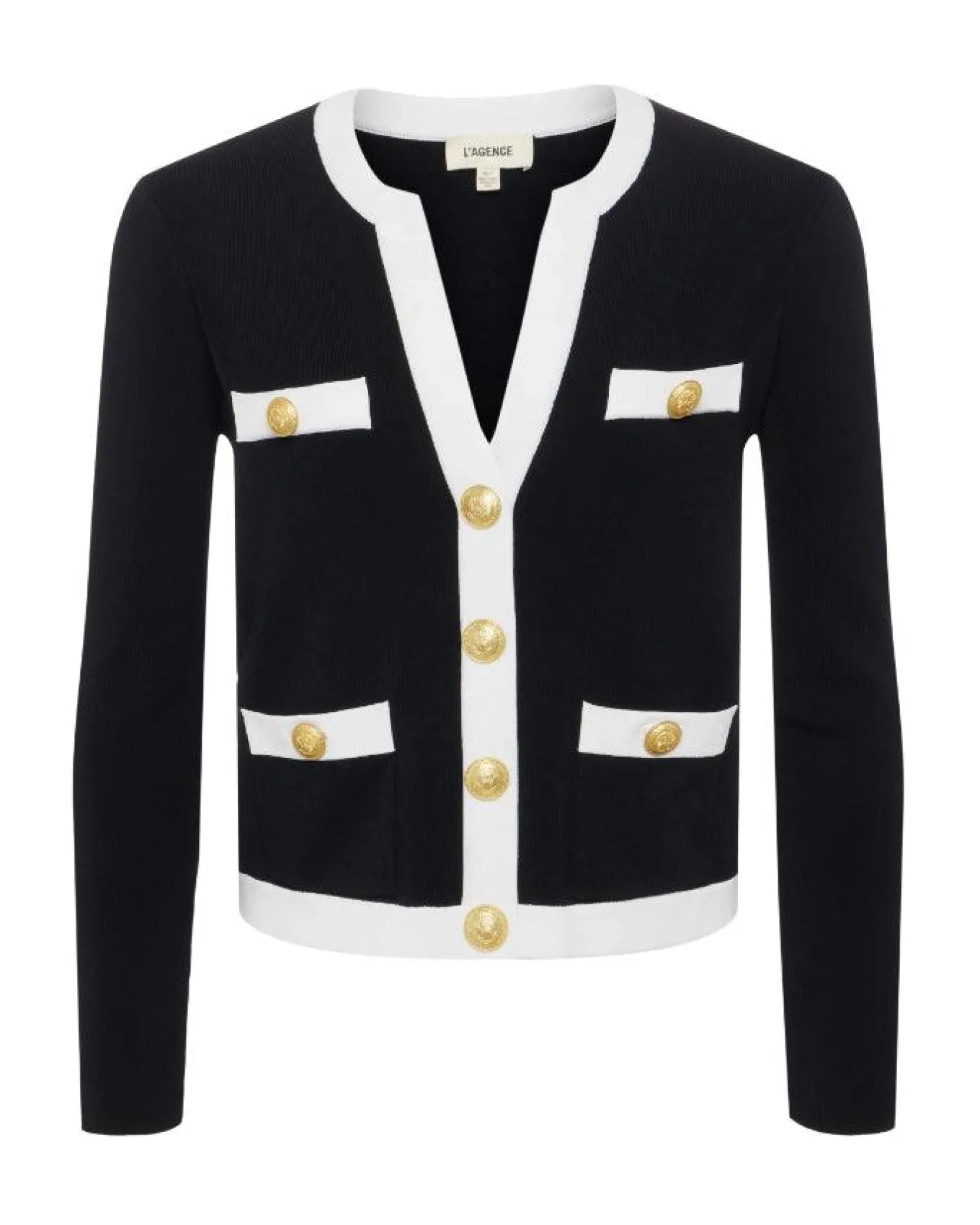 L’Agence cropped cardigan with split v-neck, front snap closure, four patch pockets, contrast trim and embossed dome buttons. Size XS – Length 20.5″, Sleeve Length 22.75″.