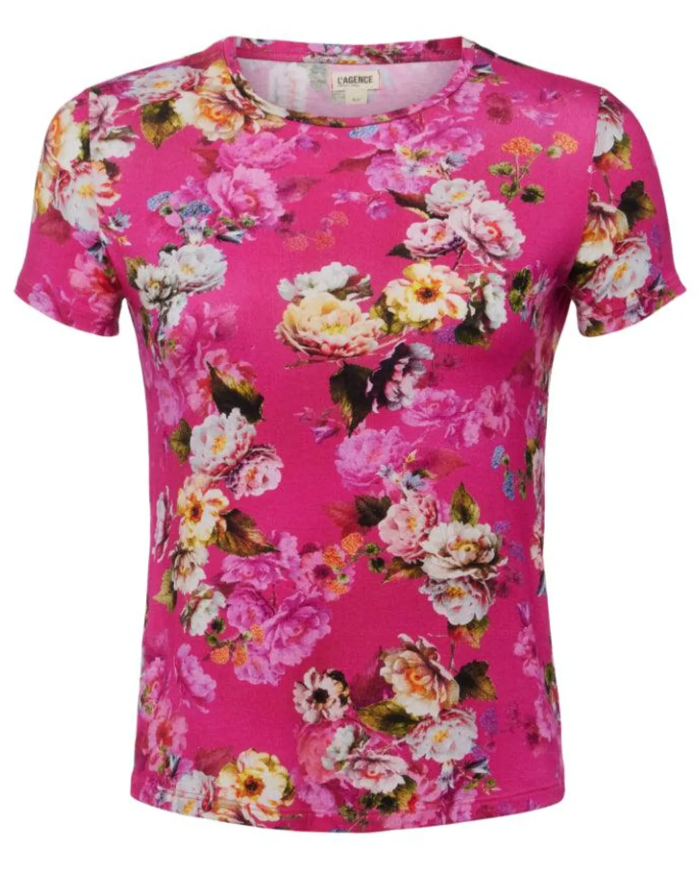 L’Agence quintessential slim fit tee in floral print, supple microfiber stretch fabric with crew neck and short sleeves, Size XS – Length 24.75″, Sleeve Length 5.25″.