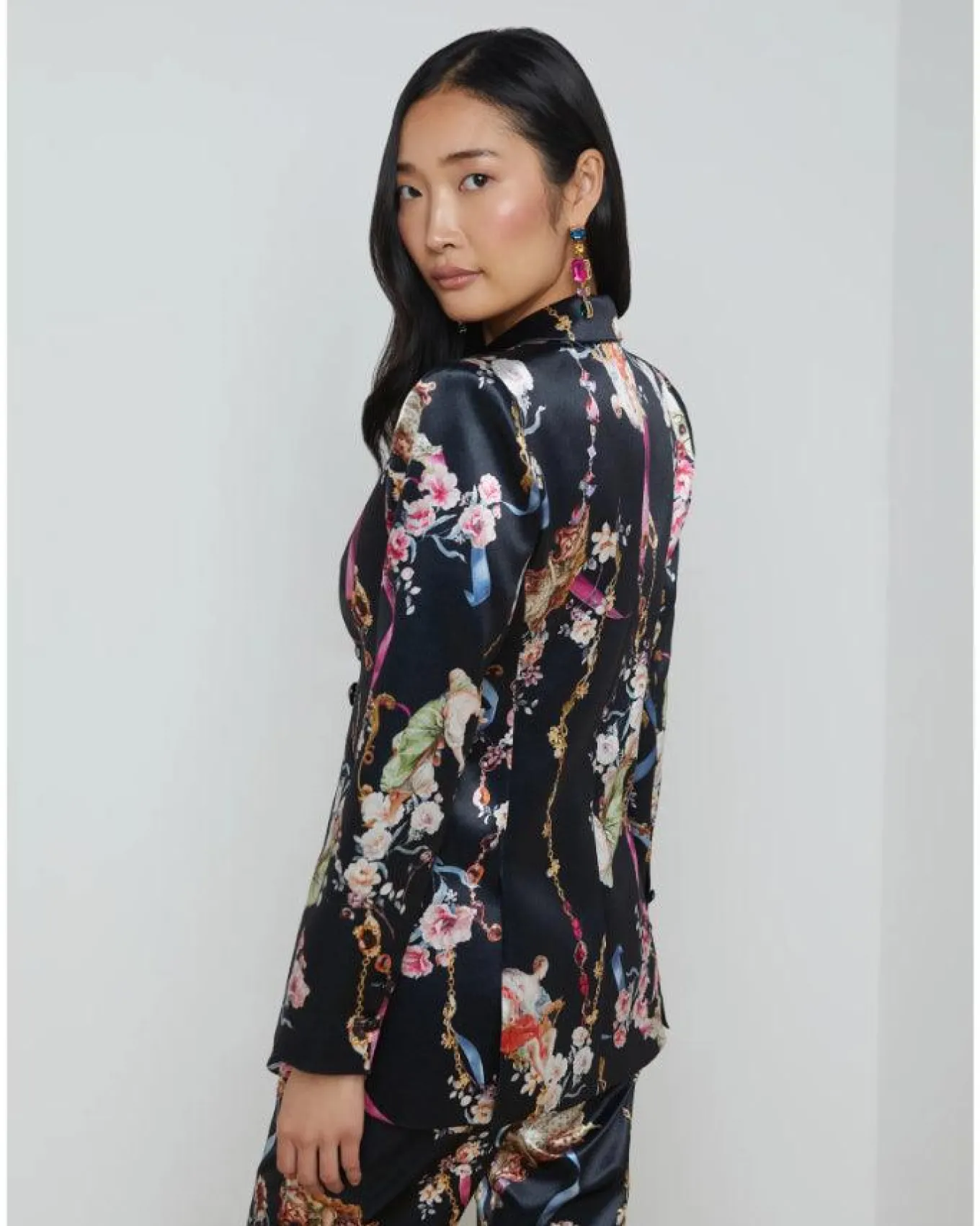 L’Agence sleek, lustrous satin print single breasted longline blazer with peak lapel, strong shoulders, welt pockets, embossed dome button closure, button cuffs, fully lined. Cut close to the figure for a flattering, slim fit. Size 2 – Length 29.5″, Sleeve Length 24.25″