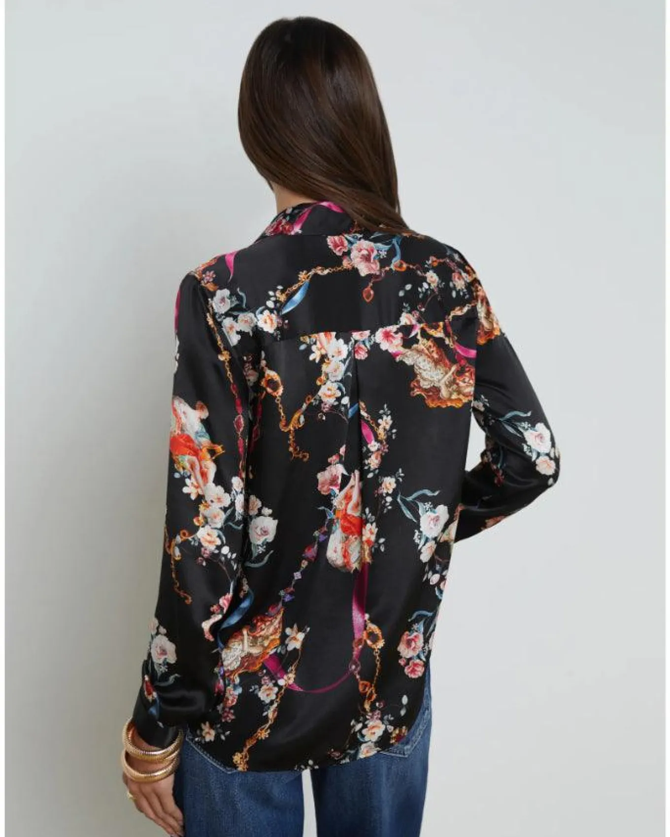 L’Agence silk charmeuse timeless rococo angel print blouse with a sharp collar, button front, back pleated yoke, and long button-cuff sleeves. Size XS – Sleeve Length 24″, Length 26.5″.