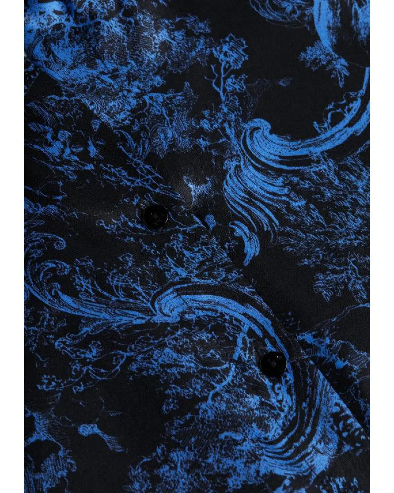 L’Agence iconic silk charmeuse black periwinkle rococo toile print blouse with a sharp collar, button front, back pleated yoke, and long button-cuff sleeves. Size XS – Length 26.5″, Sleeve Length 24″.
