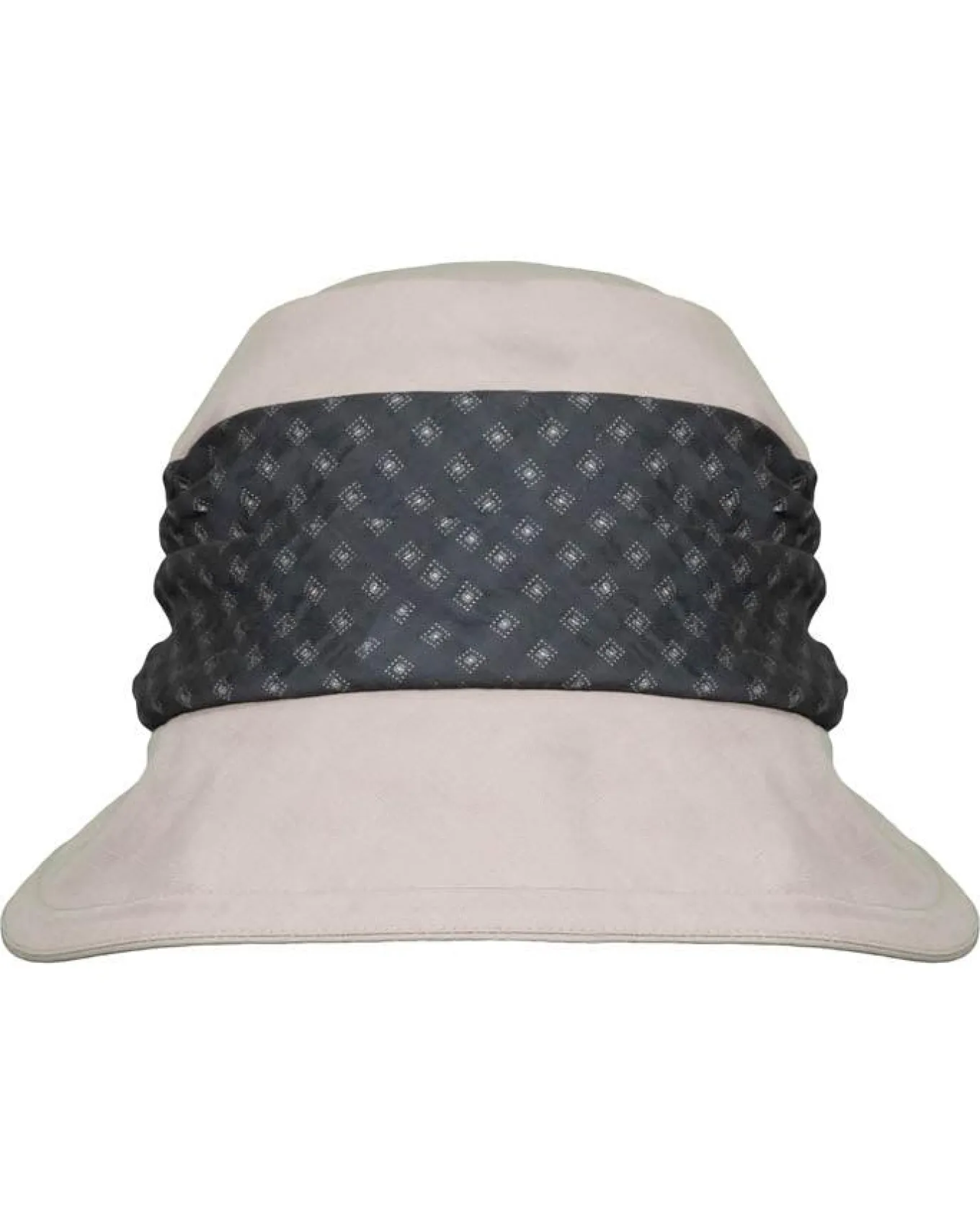 Lillie and Coho cotton blend bucket hat with wider rim in front than back, wear rolled up or left down and contrast wrap band.