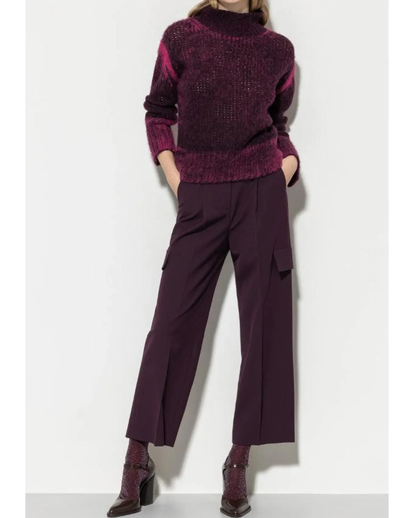 Luisa Cerano soft techno-wool wider cut cargo pants in a cropped length with pleats, two slit pockets and two flap pockets with sporty flap on the back, concealed button, hook and zipper fastening.