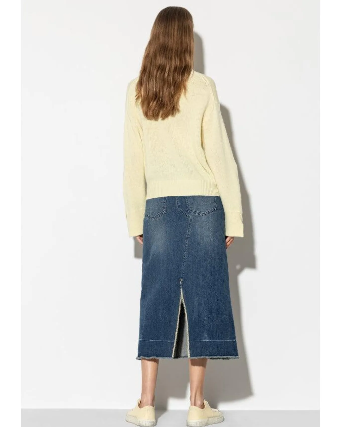 Luisa Cerano long skirt in authentic stretch denim with a subtle used wash and an open hem with short fringes. The skirt has a classic five-pocket design and features asymmetric seams on the front and back and a long slit.