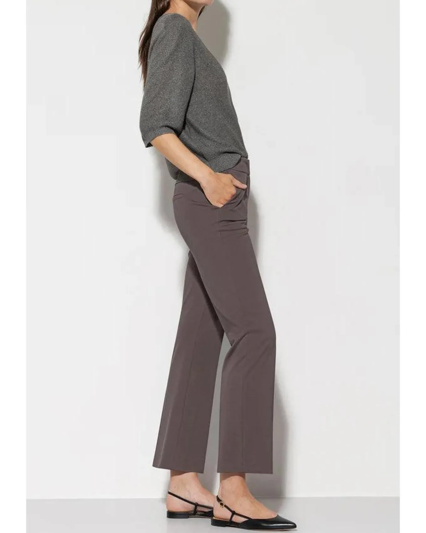 Luisa Cerano baby flare trousers in a suit silhouette made from soft Punto Milano with cropped legs, creases. front slant pockets, one back mock welt pocket, hook, button and zip closure.