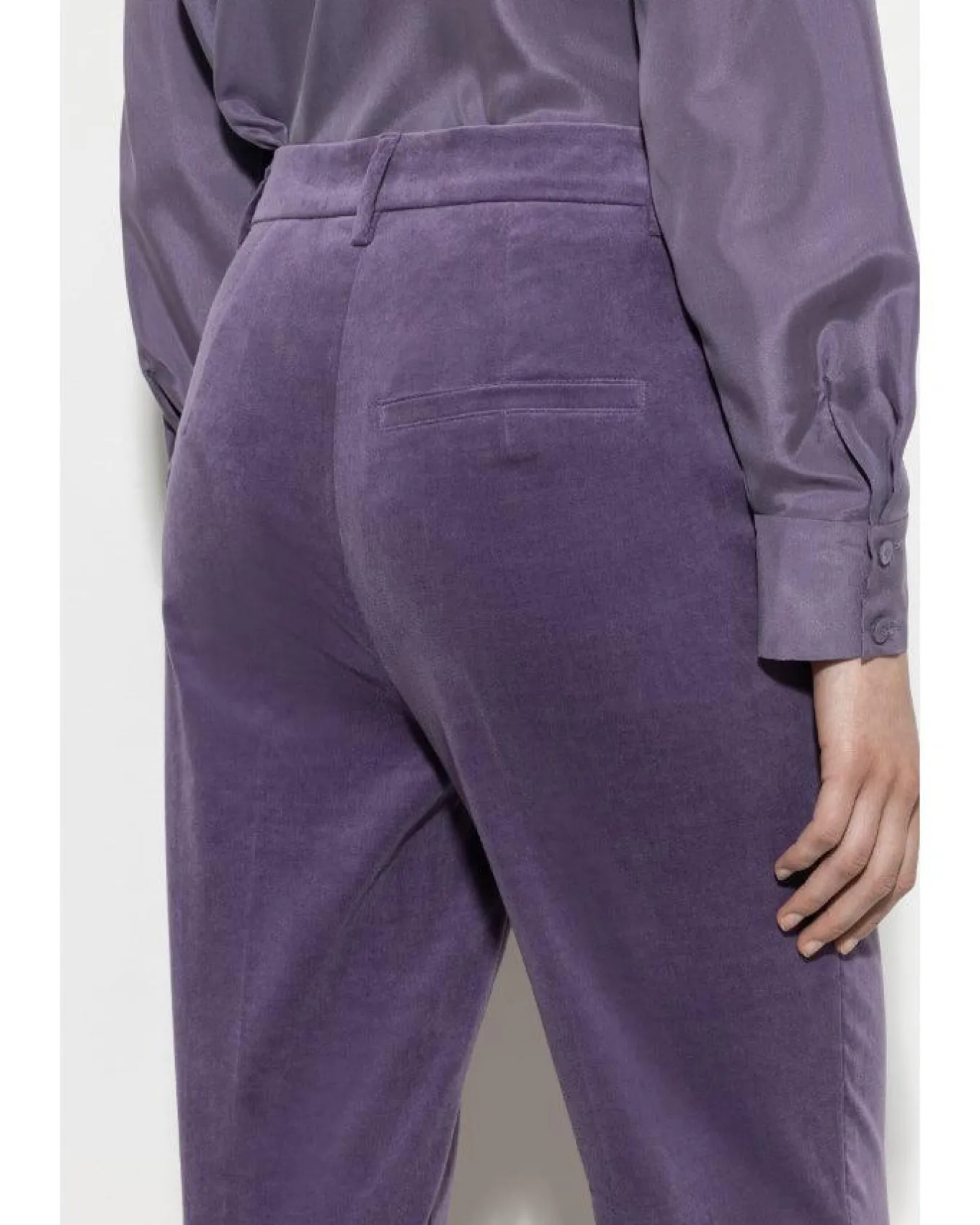 Luisa Cerano soft stretch velvet, slightly cropped pants complemented by creases, two slit pockets, one welt back pocket, short slits at hem, button, hook and zipper fastening.