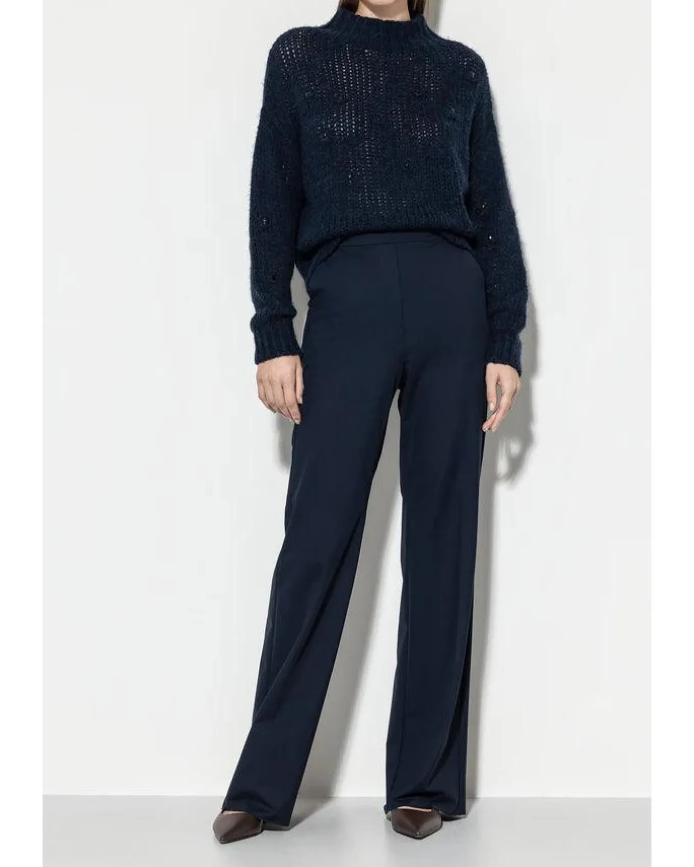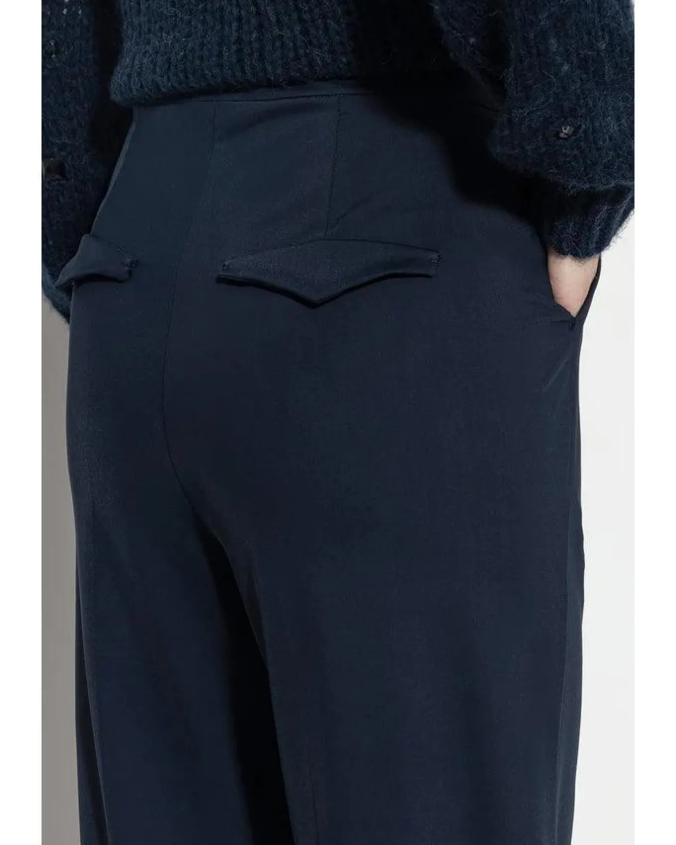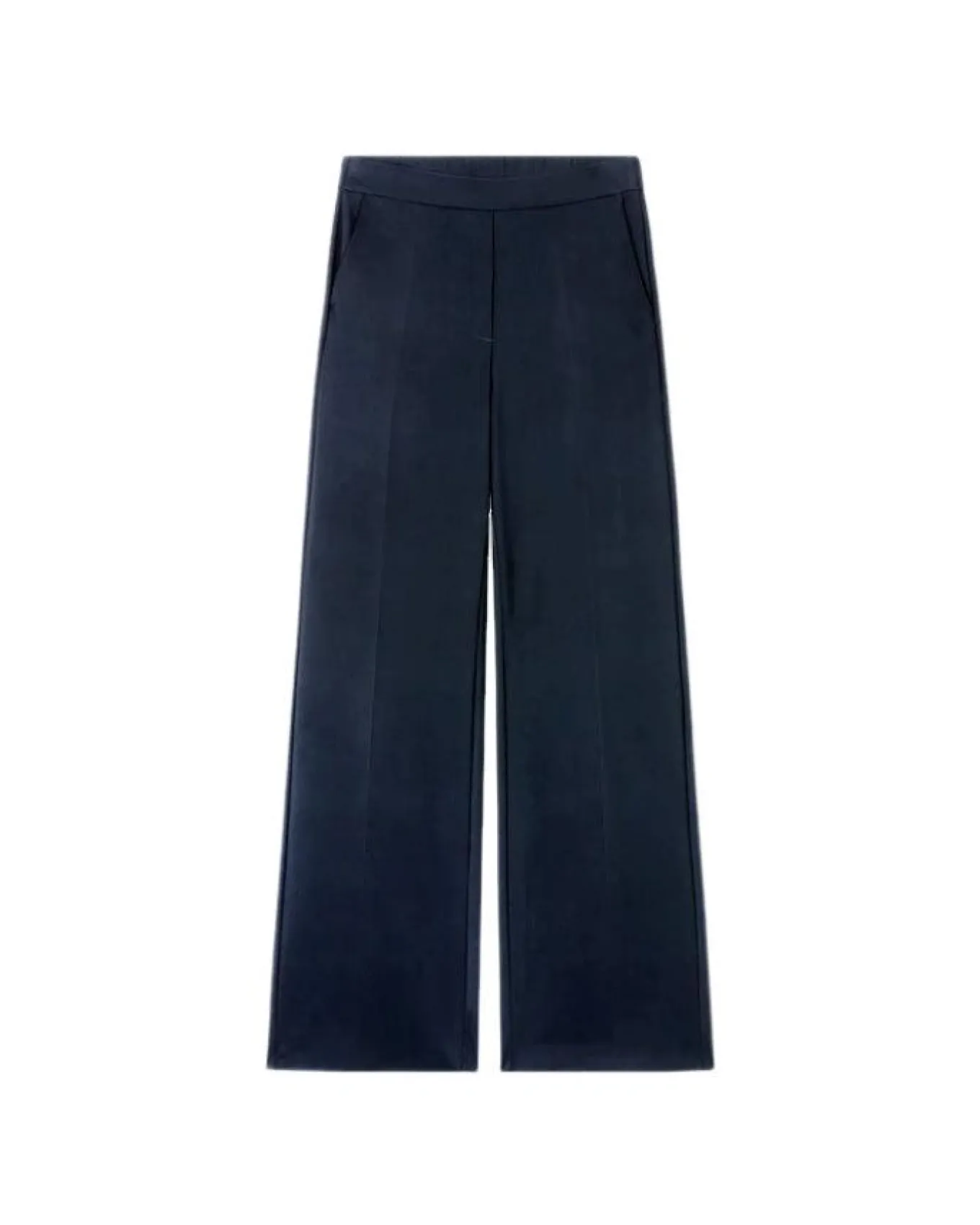 Luisa Cerano softshell techno jersey high stretch full length pants with wide leg silhouette, elasticated waistband, front slit pockets and fake flap pockets on back.