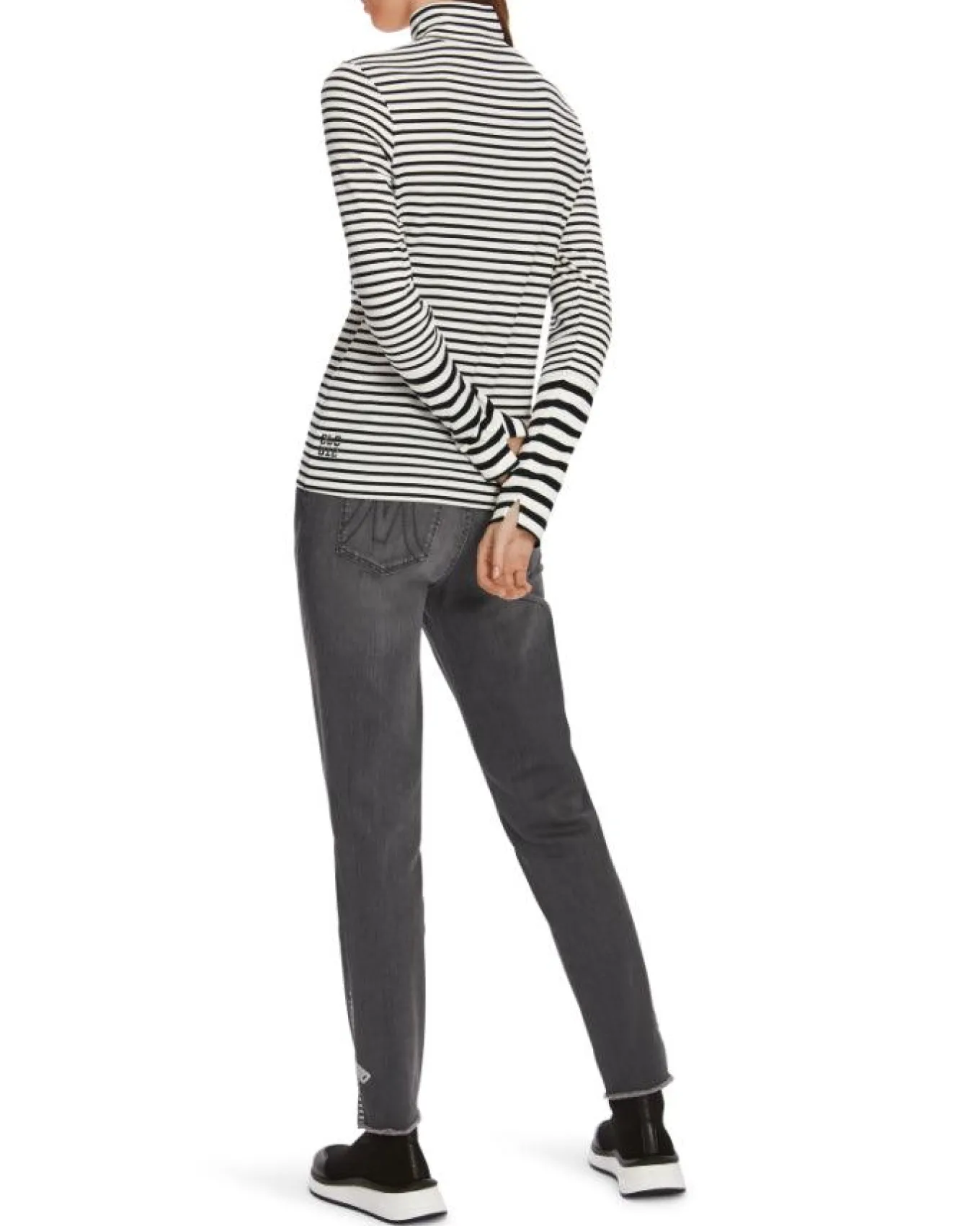 Marc Cain cotton striped funnel neck pullover with long sleeves and contrast wider stripe detail from elbow to sleeve end.