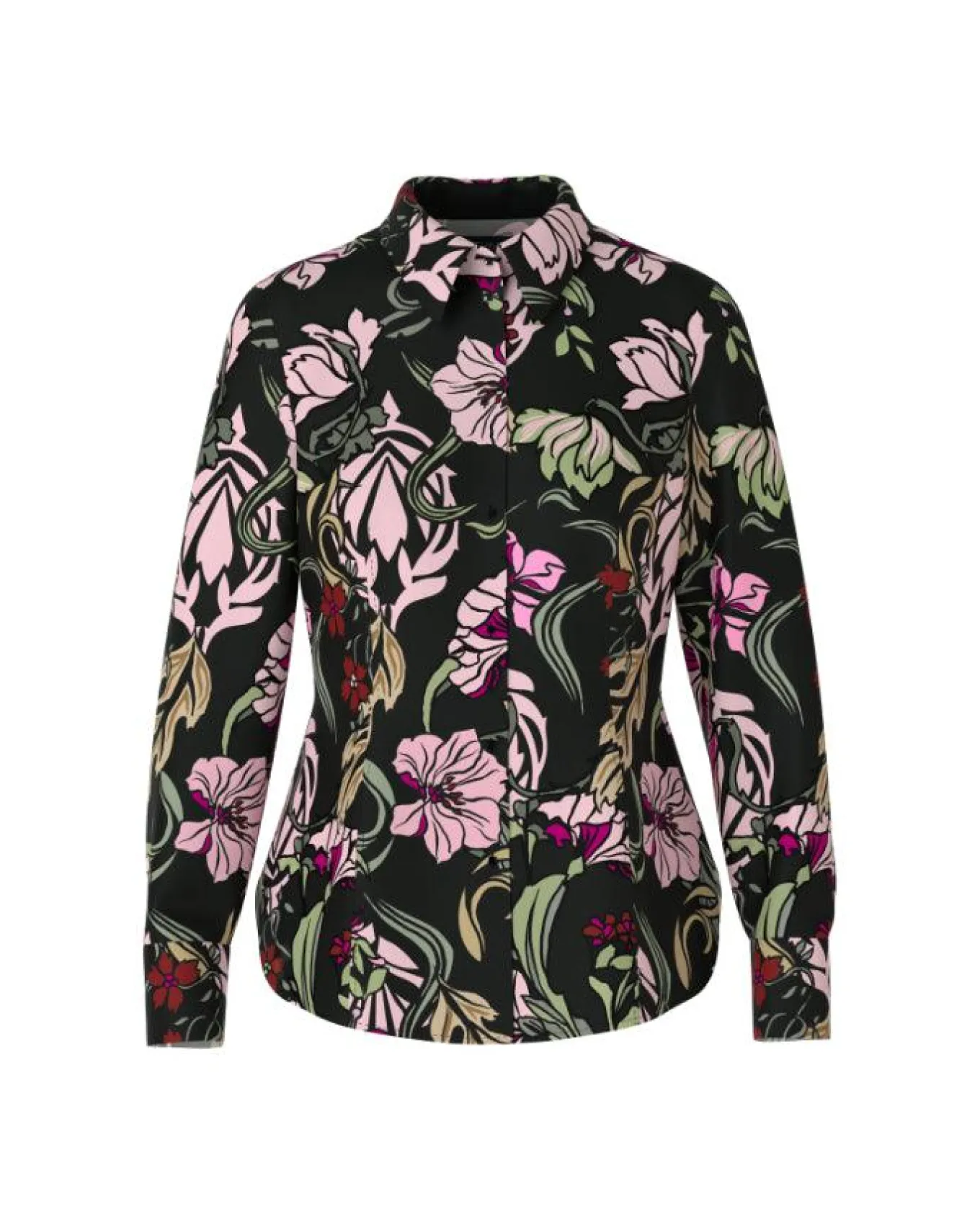 Marc Cain luxurious stretch fabric floral print shirt features traditional shirt styling with a collar, long sleeves with button cuffs, and button front closure.