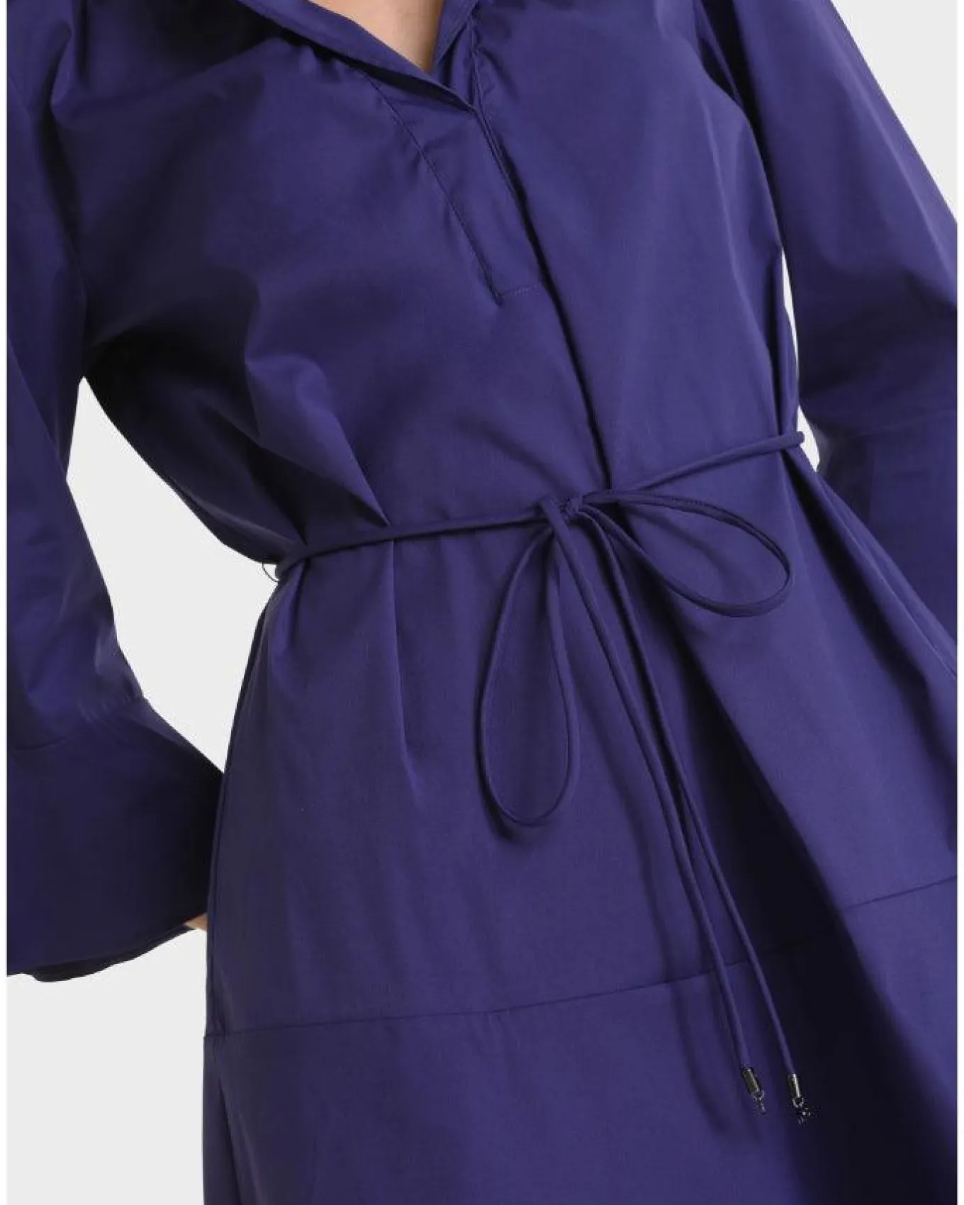 Marc Cain summery lightweight cotton blend dress with flounce 3/4 sleeves, v-shape ruffle neckline, loose silhouette fastened with tie belt.