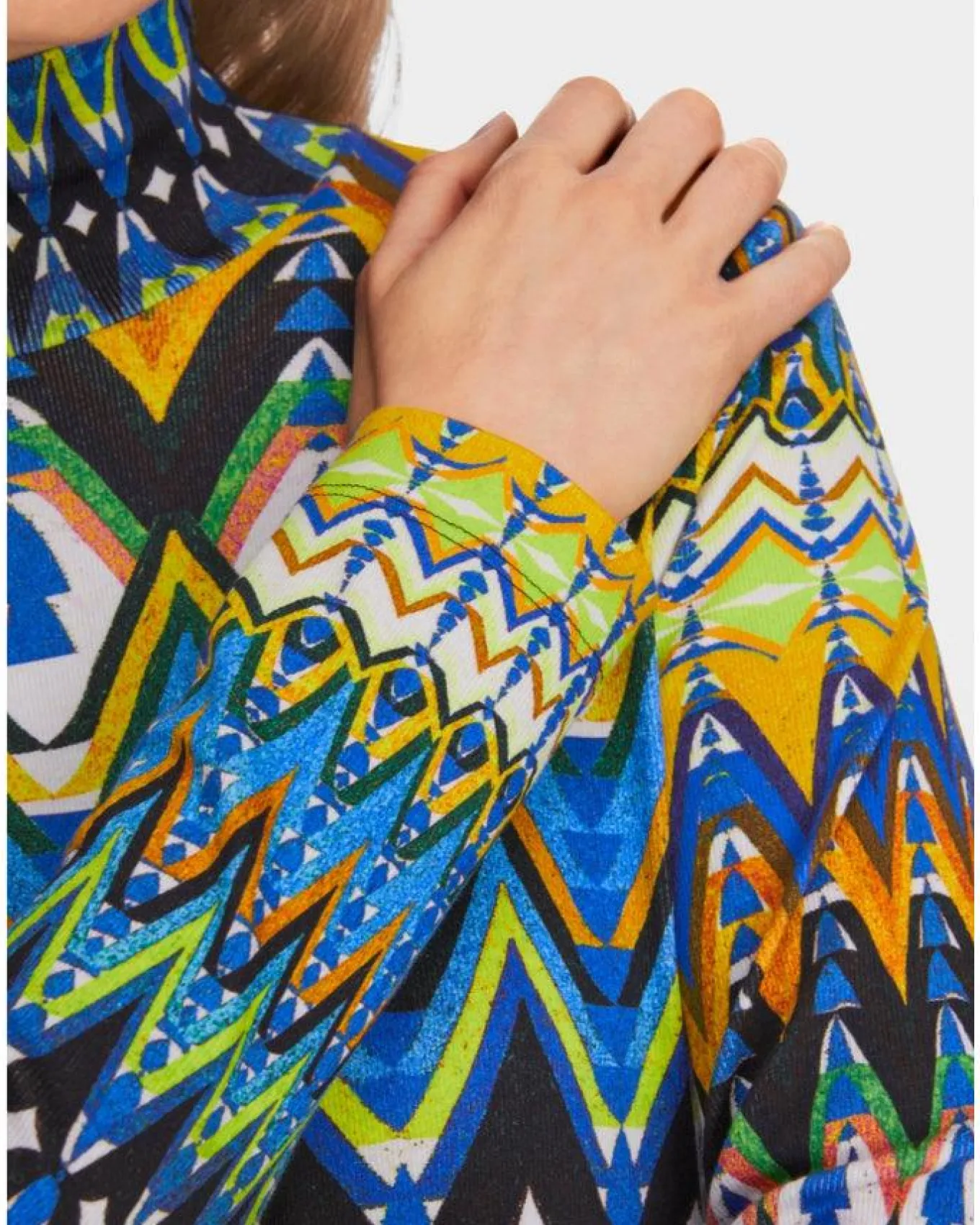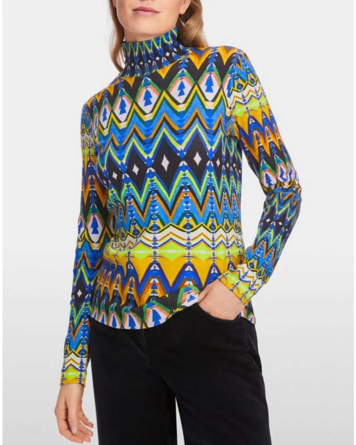 Marc Cain fitted ribbed cotton long sleeve turtleneck tee with an all over colorful print.