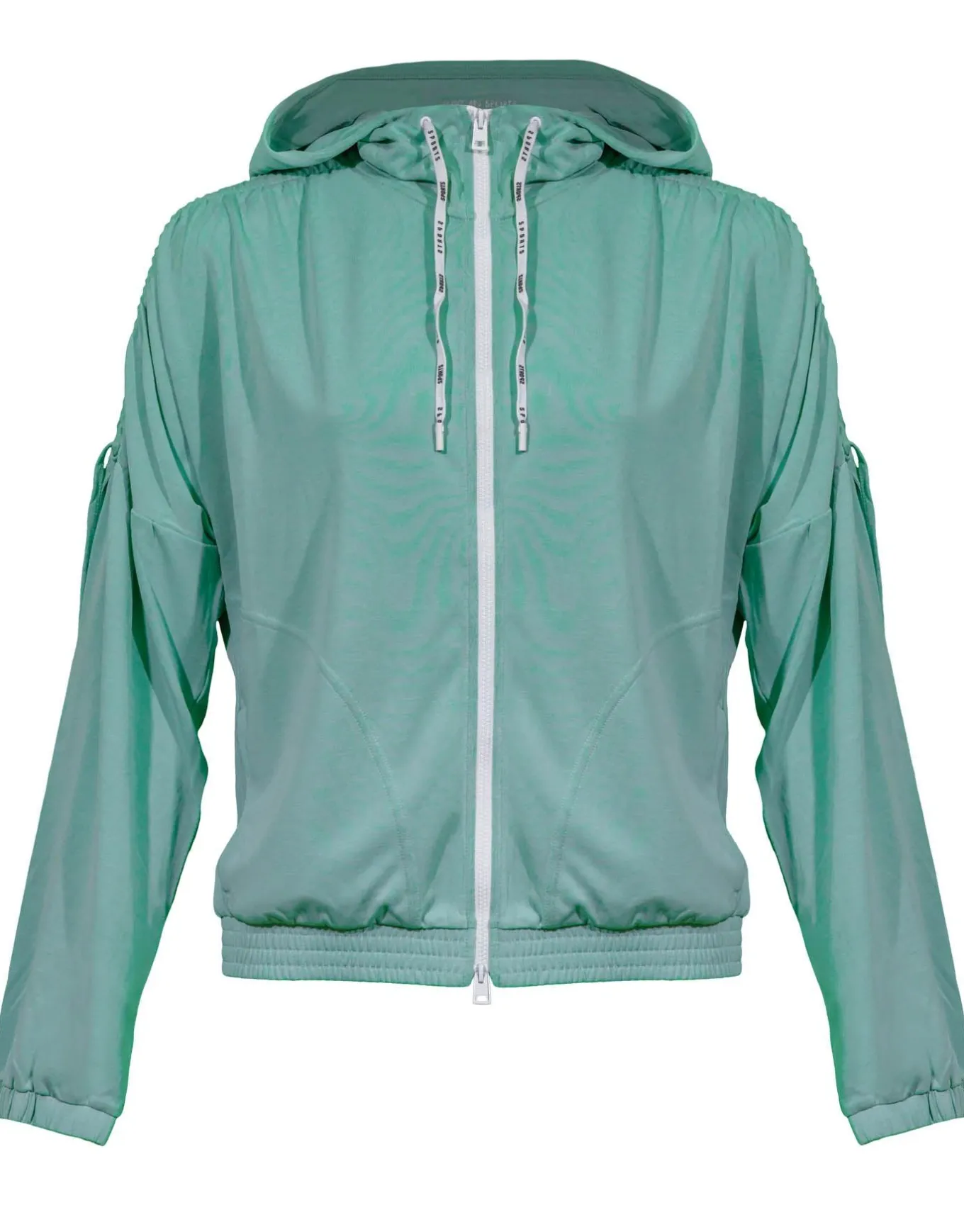Casual fit ultra soft modal blend flowing hooded jacket with gathered details and stretchy cuffs on the sleeves, inset pockets and two-way zip closure