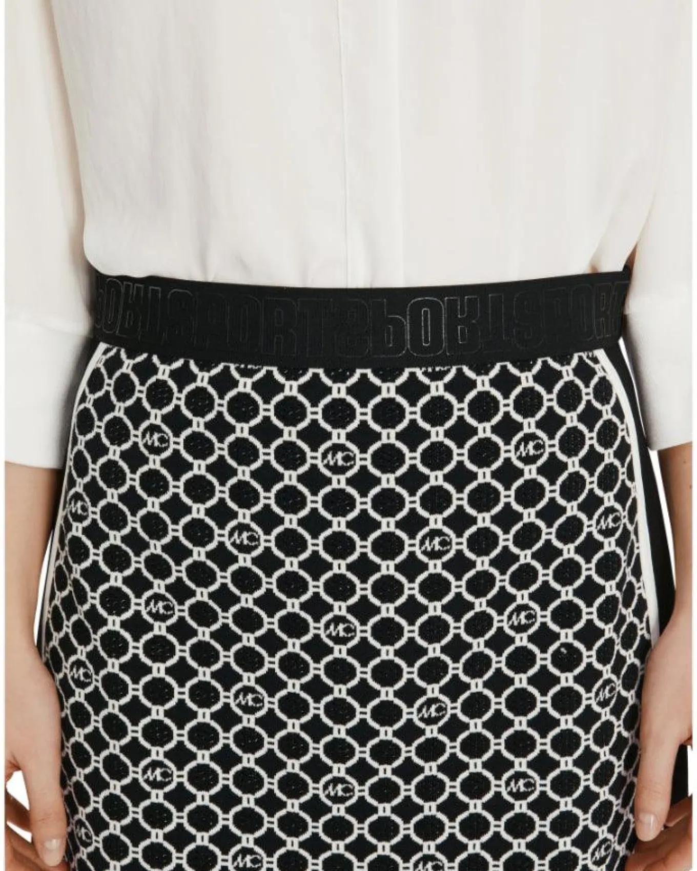 Marc Cain jersey mini pull on skirt with an exclusive MC print front, solid back, SPORT embossed elastic waistband, Length 49.5cm.
