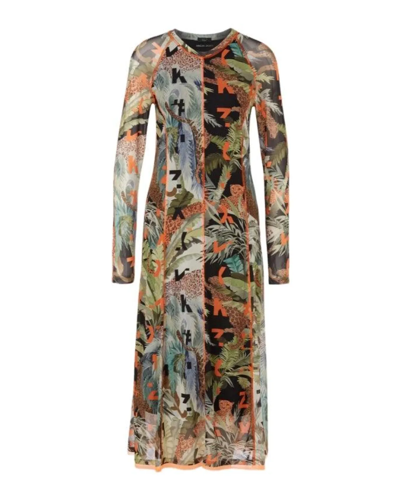 Marc Cain sporty elegant silhouette print dress fits close to the body and flared towards hem with long raglan sleeves. The cut panels and hem are accentuated with fluorine-coloured details. The mesh material is made from stretch jersey and has a plain lining. The design features Marc Cain Leo in a collage of leaves and letters.Length 125cm