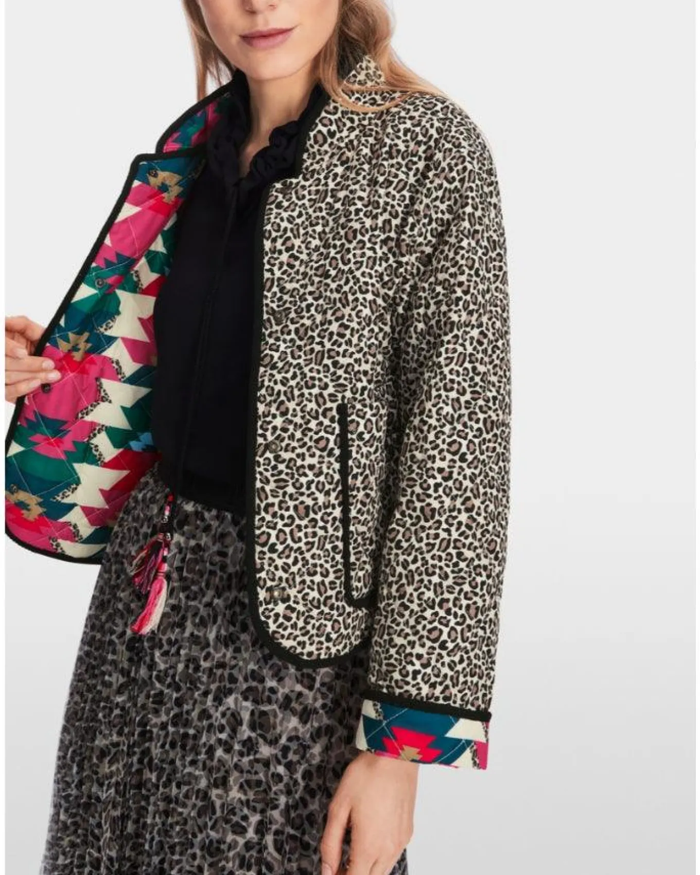 Marc Cain elegant straight cut quilted jacket with a stand collar, slanted zip pockets and press stud fastening. The edges are trimmed with a contrasting coloured wool border. The garment is Reversible and offers an exciting contrast between the ethnic and leo fur motifs.
