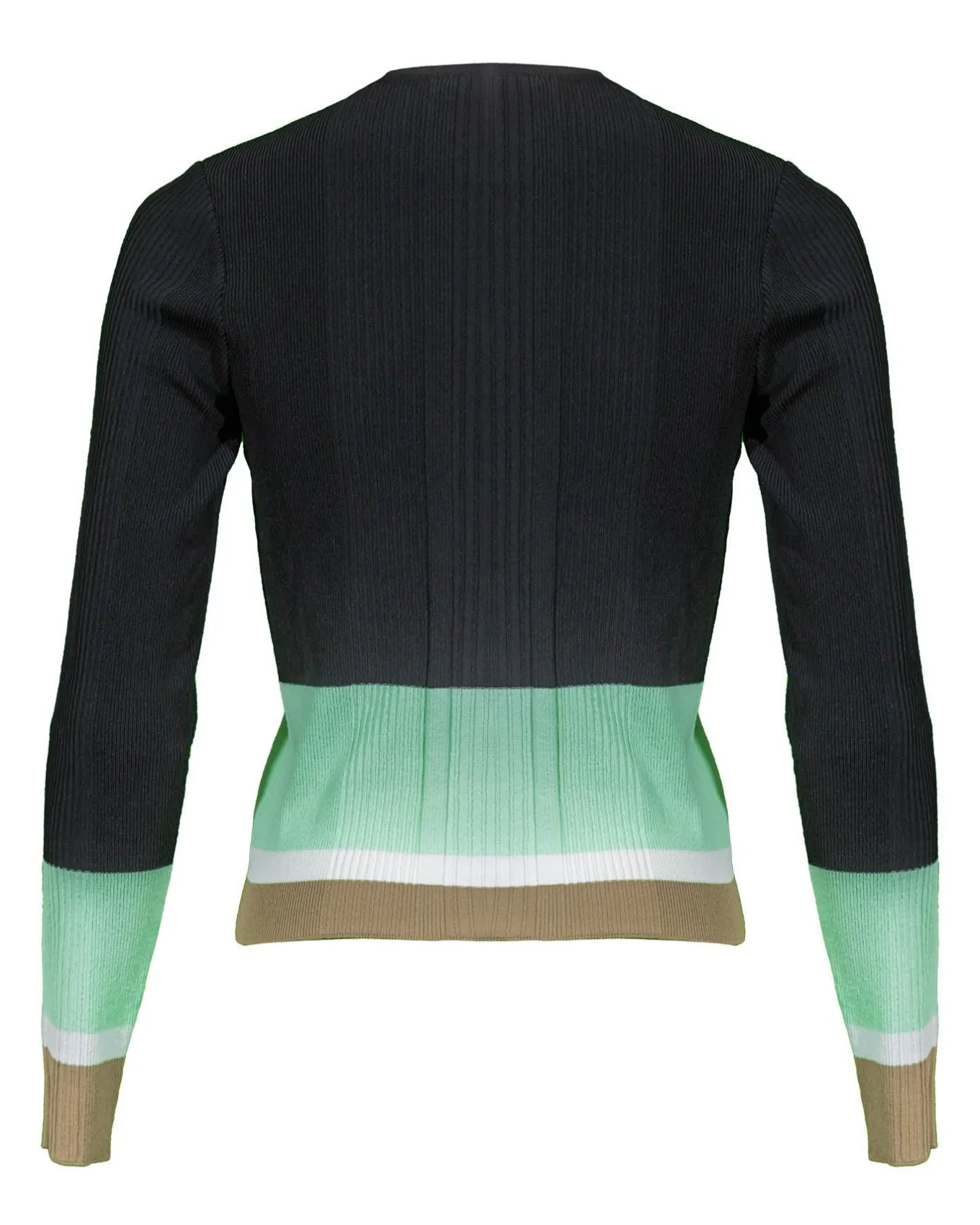 Round neck long sleeve button down caridgan in ribbed texture and color block pattern