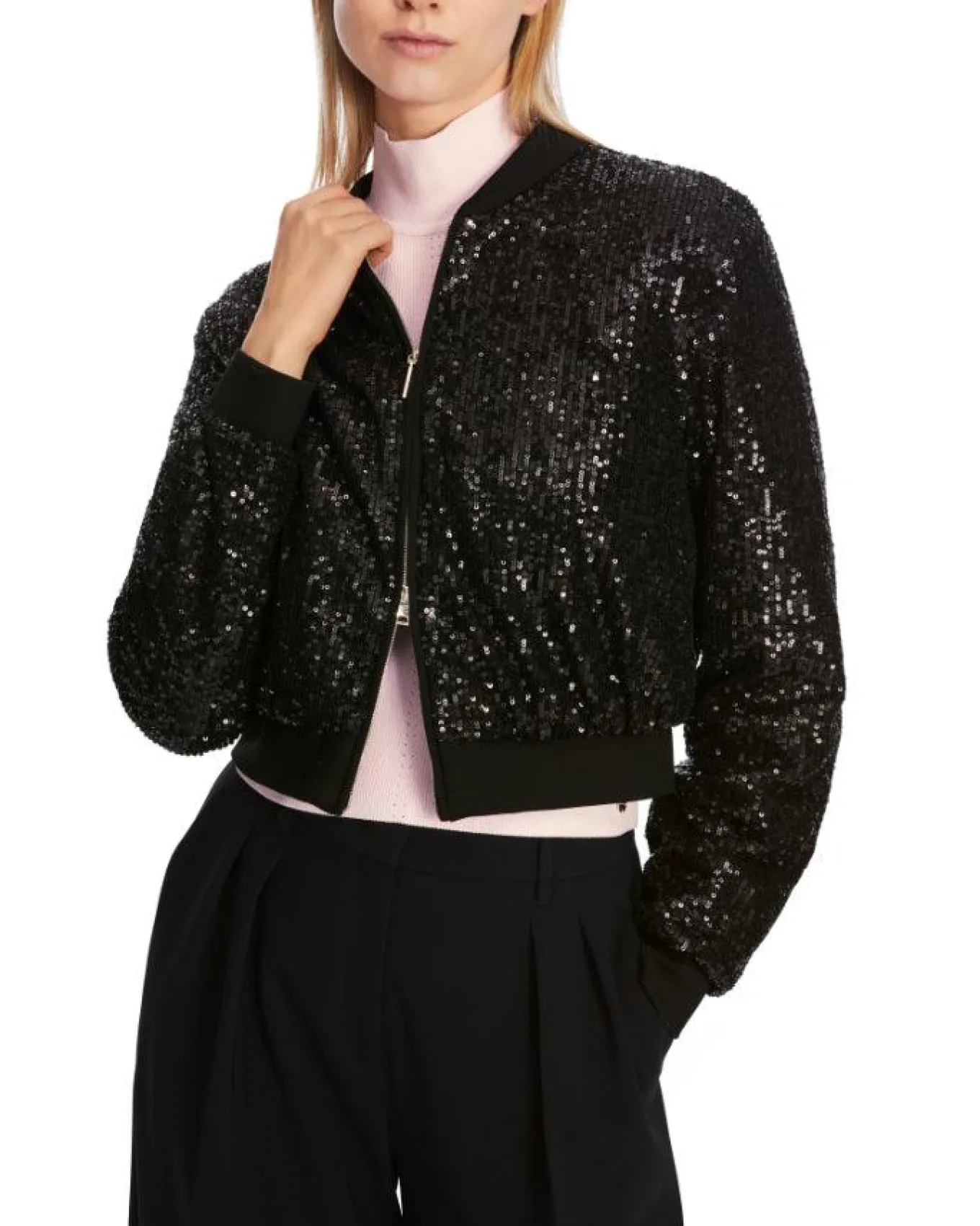 Marc Cain glamorous blouson jacket features all-over mini sequins, rounded stand-up collar, jersey cuffs, a wide short cut silhouette with two-way zip closure.