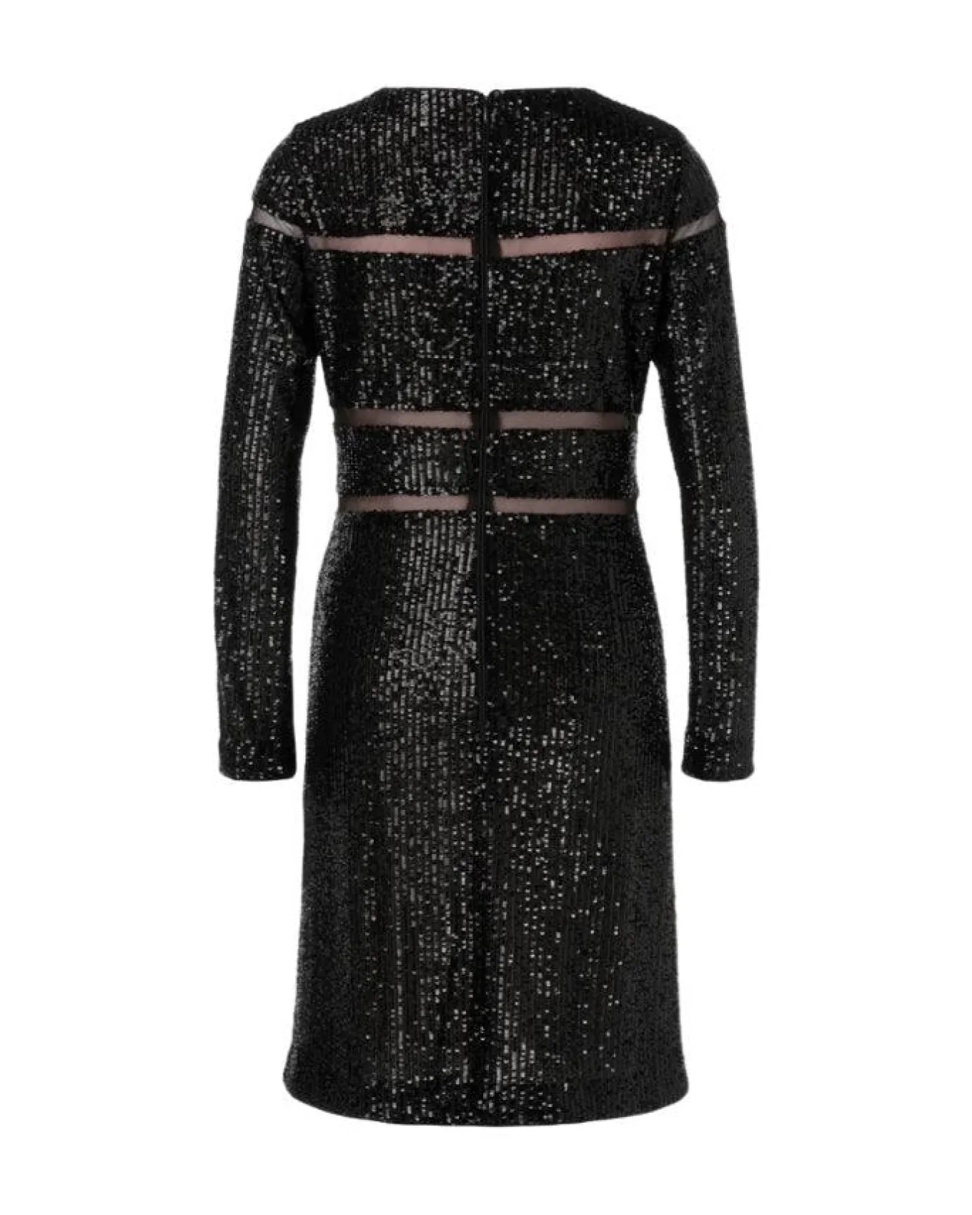 Marc Cain stand out in this long sleeve knee length fitted dress features all over sequin design with mesh cut outs, round neck and back zip closure.