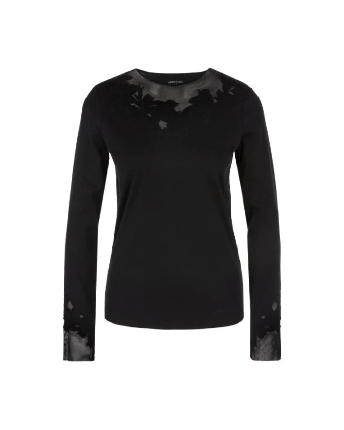 Marc Cain soft cotton long sleeve top with round neck, sheer and embroidered details on neckline and sleeve ends add a feminine touch.