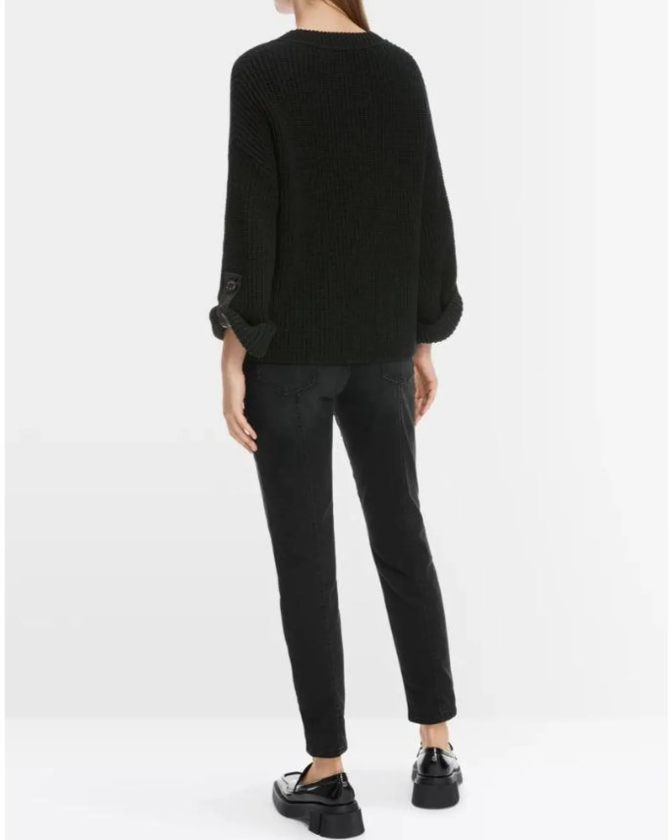Marc Cain shiny nylon patches as pockets and buttonable sleeve tabs highlight this crew neck ribbed sweater knit from wool and alpaca blend. Its casual silhouette features an extended back and side slits. Soft and warm.