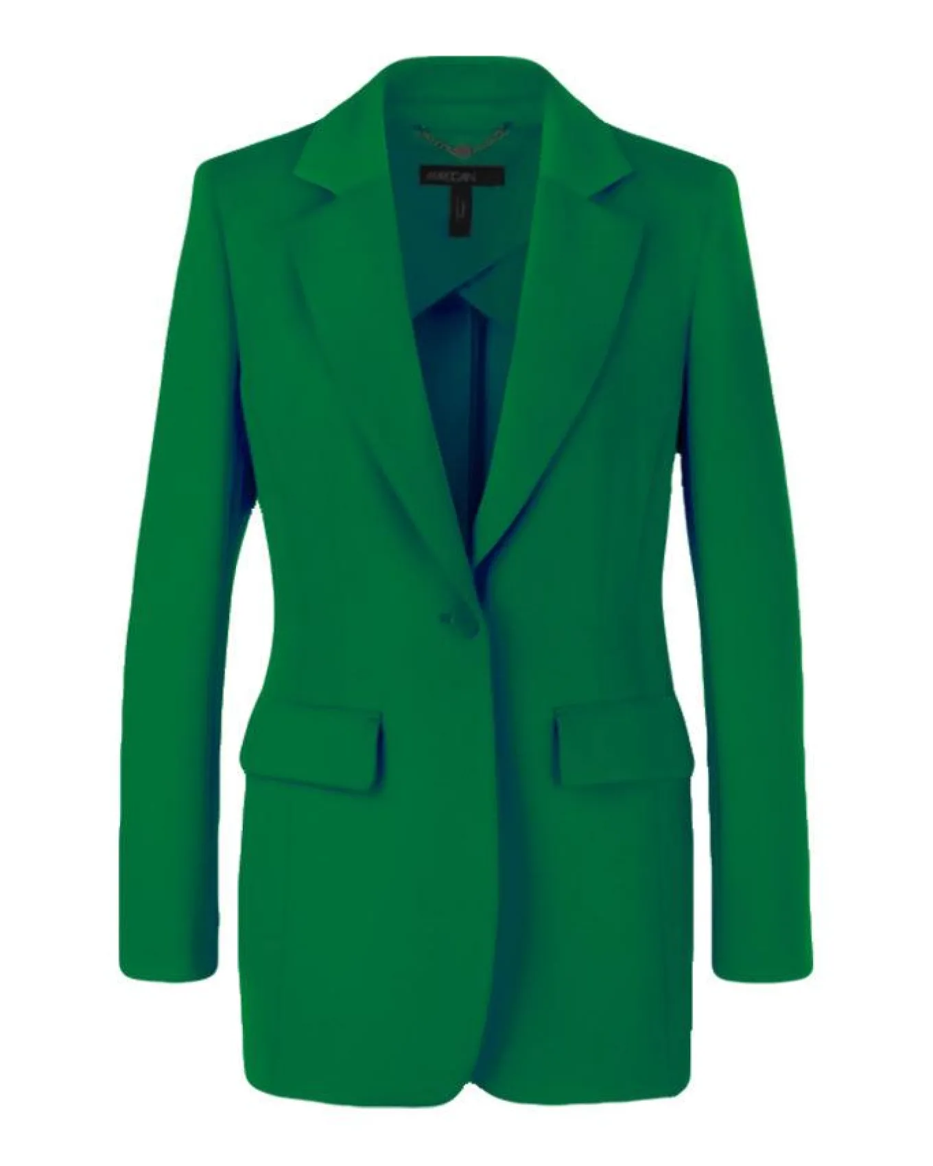 Marc Cain vibrant figure hugging elongated silhouette scuba blazer with single button closure, peak lapel, flap pockets and back vent.