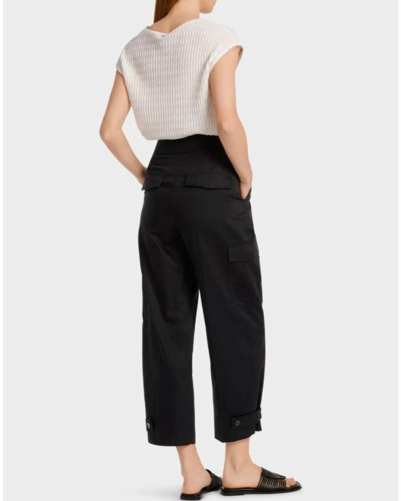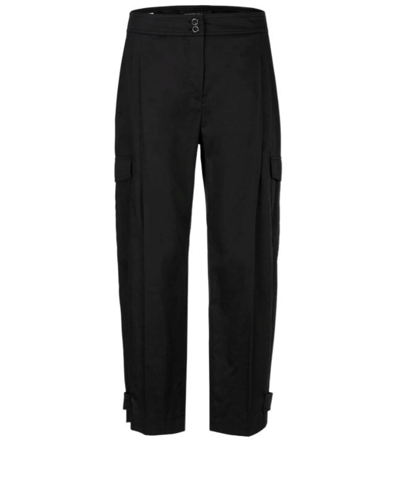 Marc Cain trendy lightweight cotton cargo pants with a wide fit, front pleats, side pockets, back flap pockets and hip cargo pockets, button and zip closure. Cropped straight legs can also take on an O-shape thanks to the adjustable bar in the hem. Length 27″