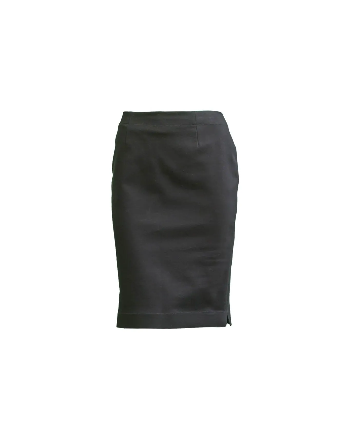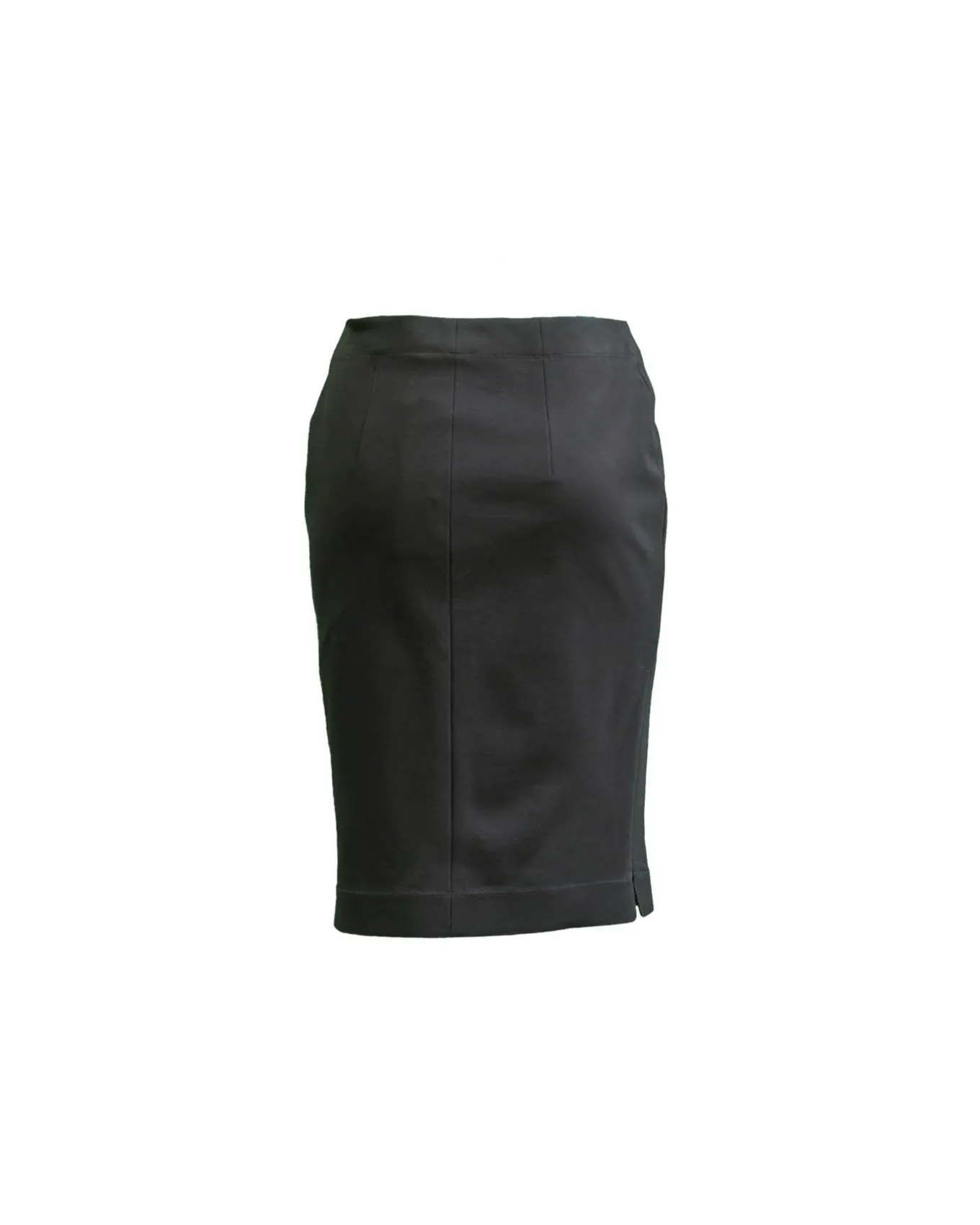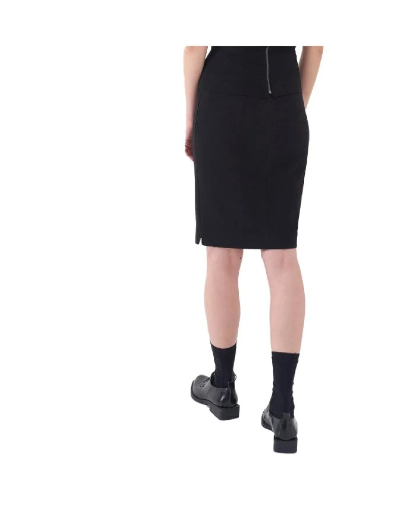 Pull on pencil skirt with elastic waistband, adjustable slit with invisible zipper on the side and techno jersey lining