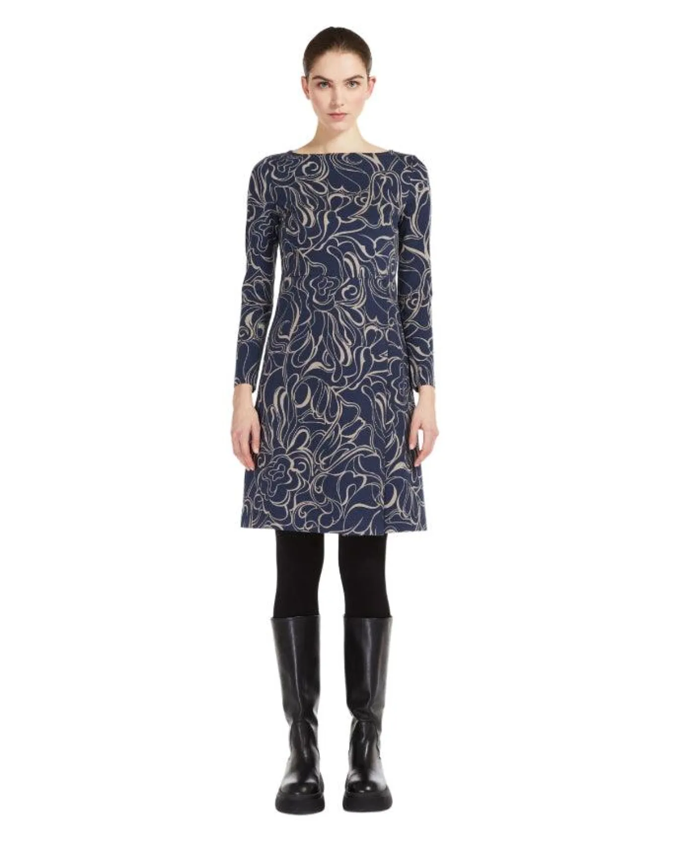 Long sleeved boat neck dress in printed interlock jersey fabric featuring a side pleat decorated skirt. The darted, slightly fitted waist enhances the garment’s femininity. Length: 96 cm