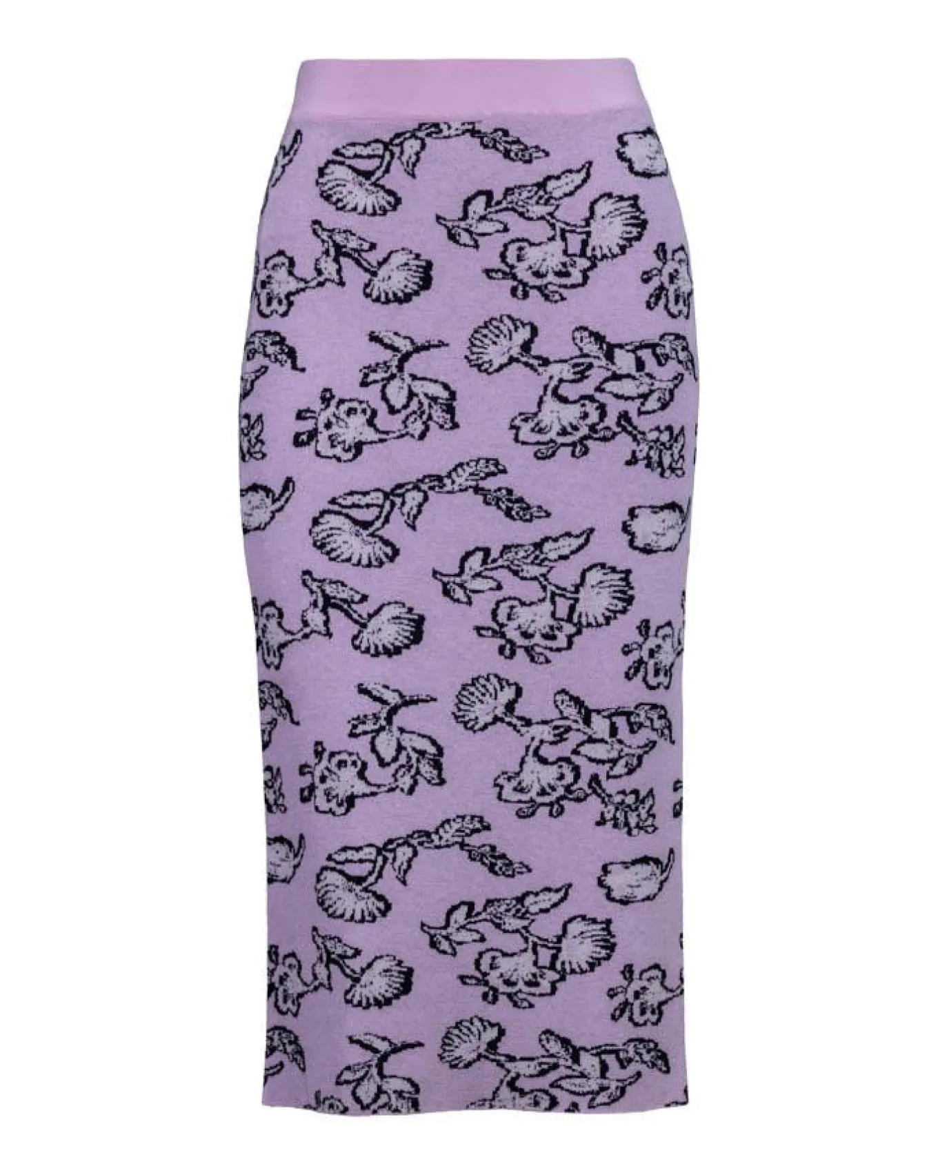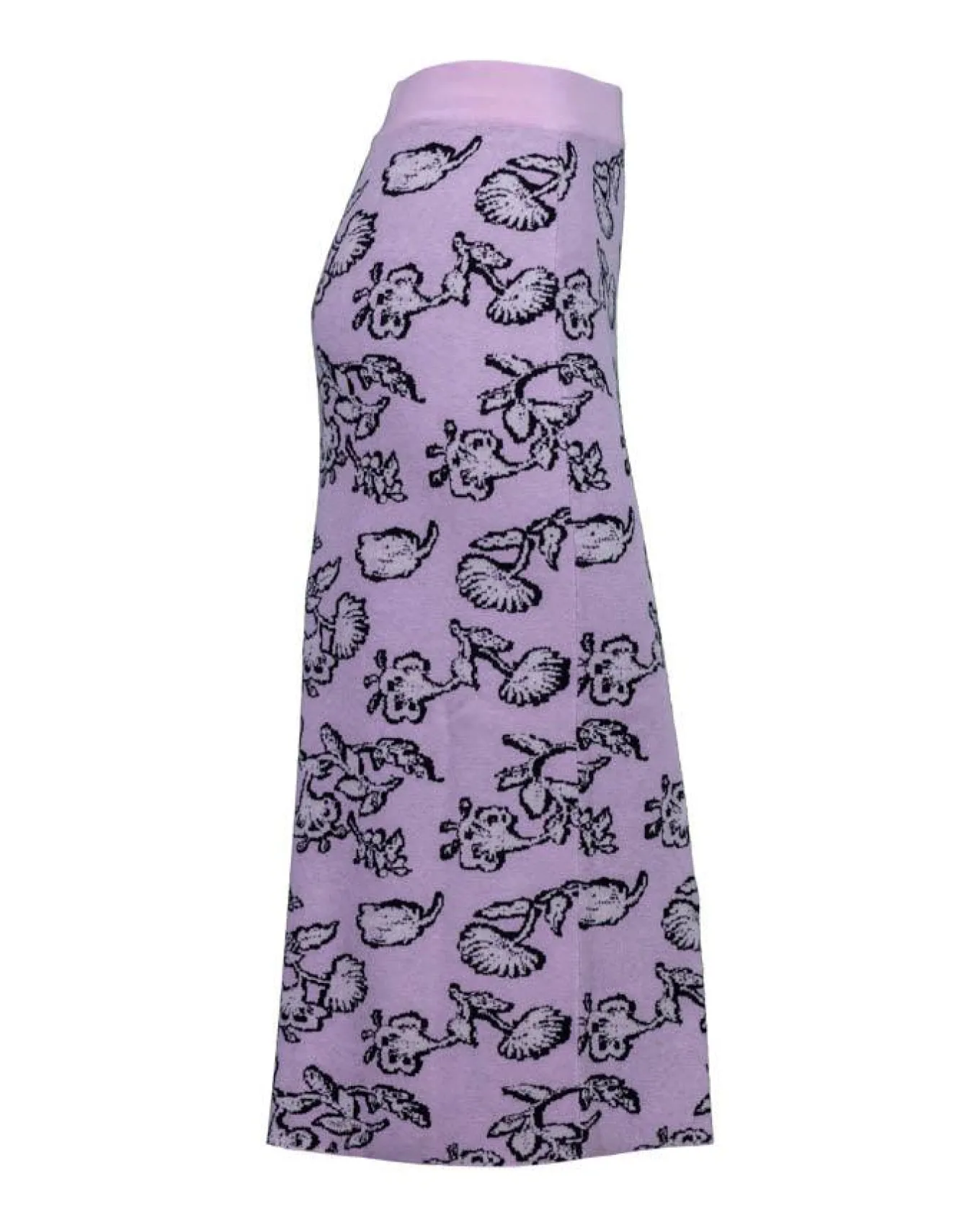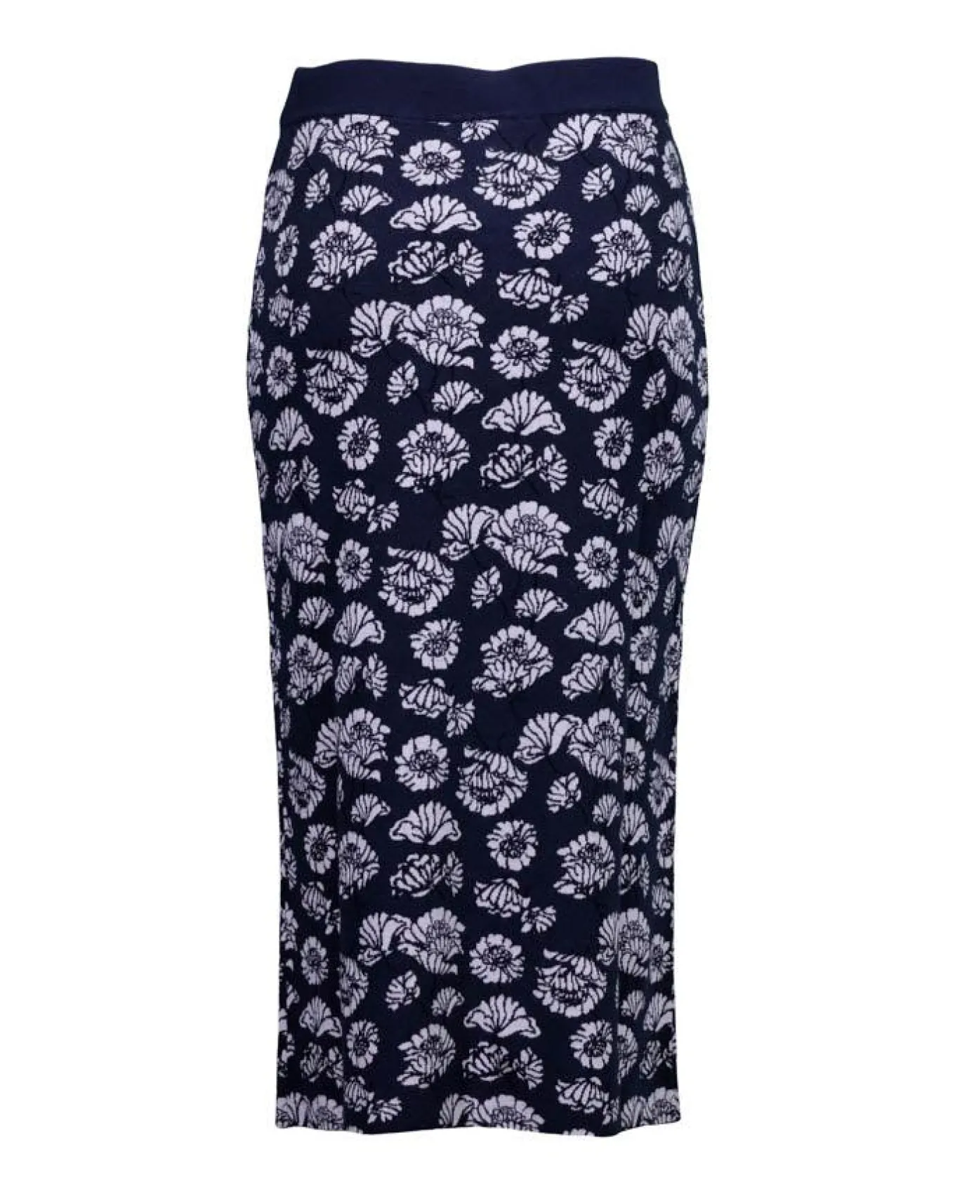 Max Mara floral print jersey knit pull on skirt with elastic band, has a straight silhouette and falls below the knee.