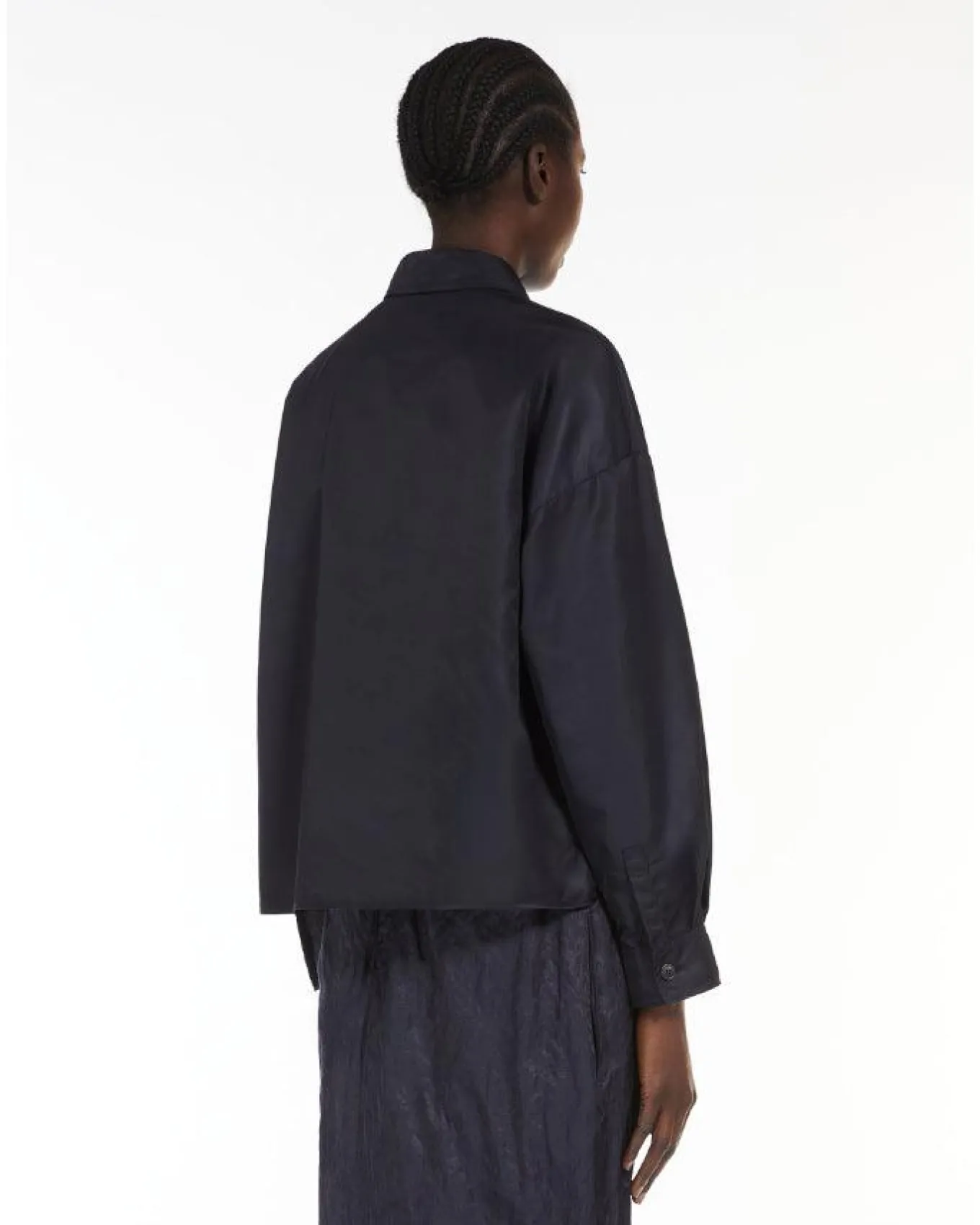 Max Mara Weekend cropped shirt jacket in water-repellent technical twill fabric featuring drop-shoulder long cuffed sleeves, a classic pointed collar and flap-adorned patch breast pockets. It also features small side slit detail, in addition to a rounded front hem and square rear hem. Visible button fastening on the front.