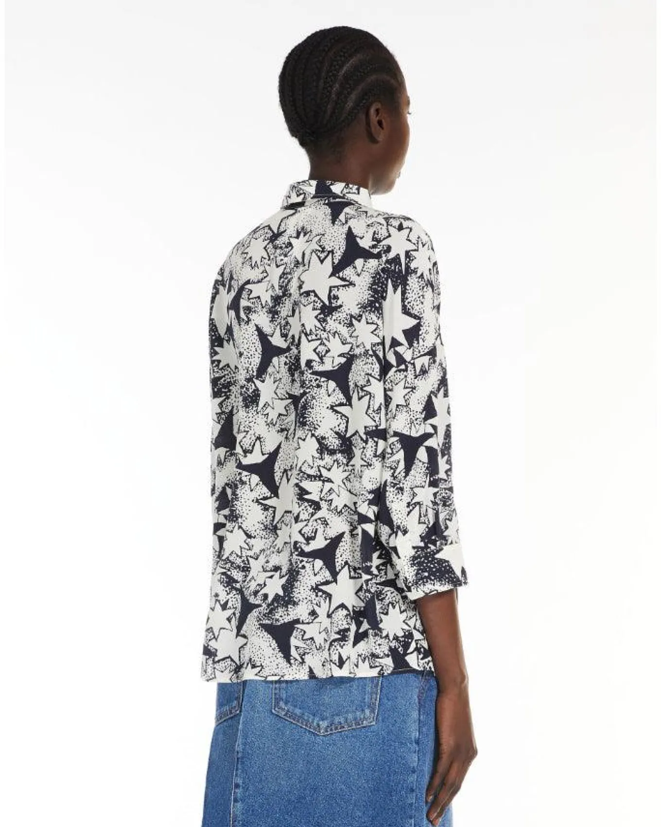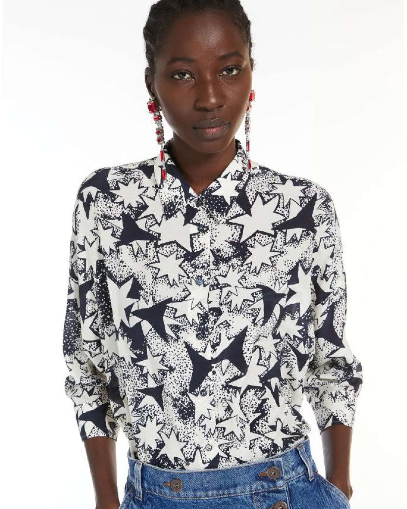 Max Mara Weekend slightly flared, relaxed-fit shirt in fine silk crepe de chine fabric featuring an all-over printed pattern, classic pointed collar and 3/4 sleeves, buttoned cuff and drop-shoulder detail. It also features a rounded hem and visible mother-of-pearl button fastening.