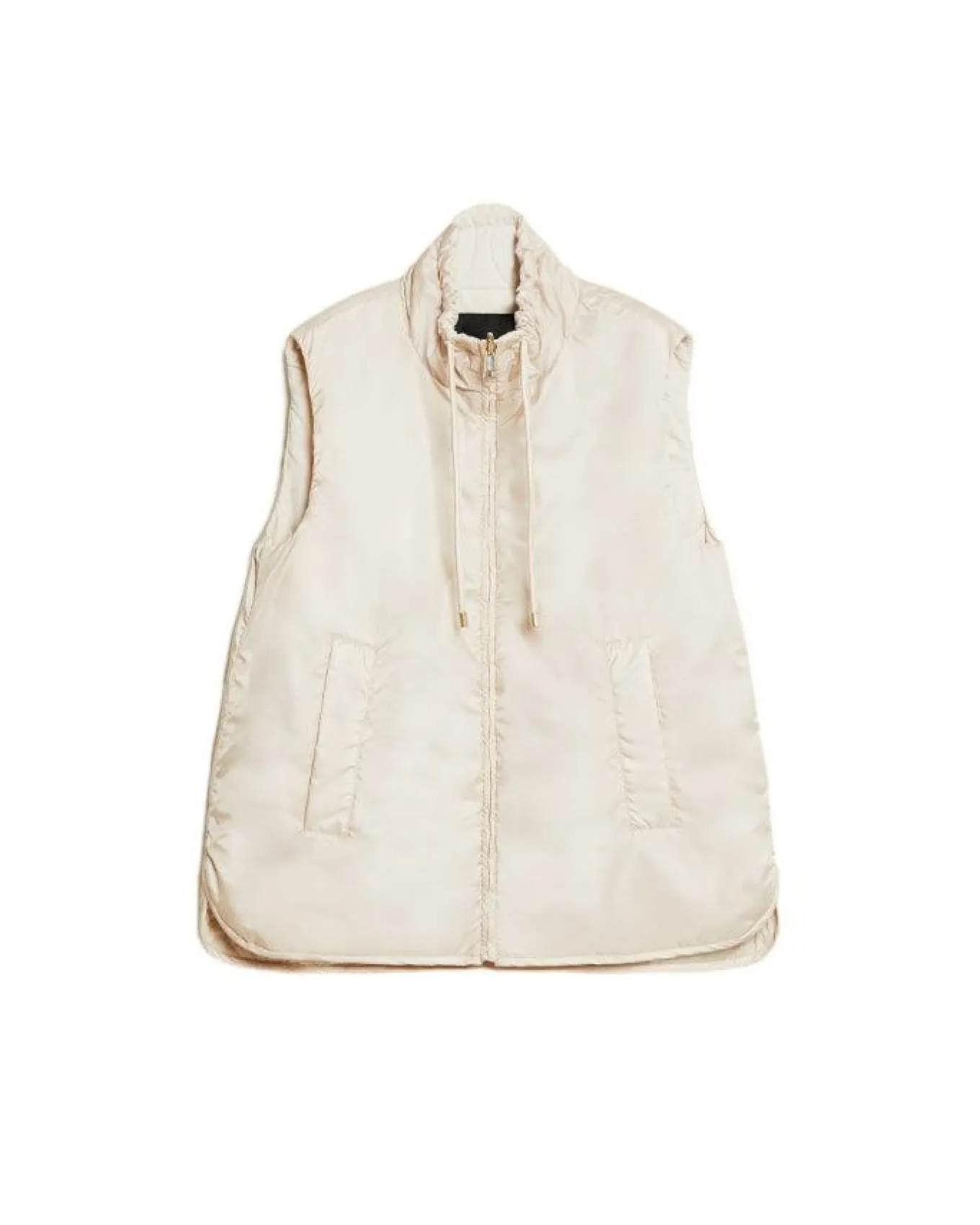 Max Mara Weekend Reversible gilet in soft water-repellent technical canvas featuring warm padding: Luxe pad Ultra Fine Insulating Technology Camel-Silk Blend Edition. The outer side boasts a perfectly smooth texture, whilst the inner side is embellished with onion quilting detail. Flared style boasts a high drawstring neck, rounded hem, press stud-fastening side slits and welt pockets. Zip fastening.