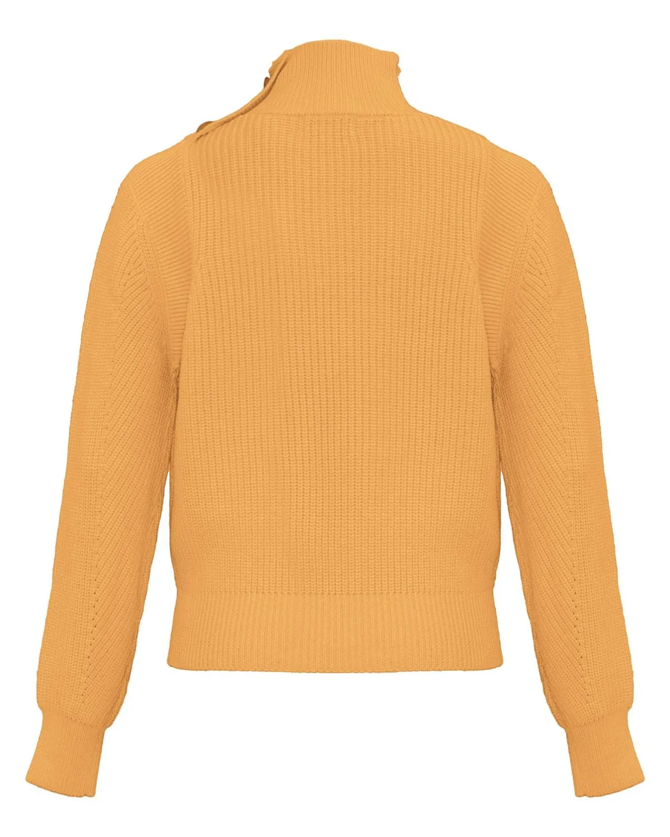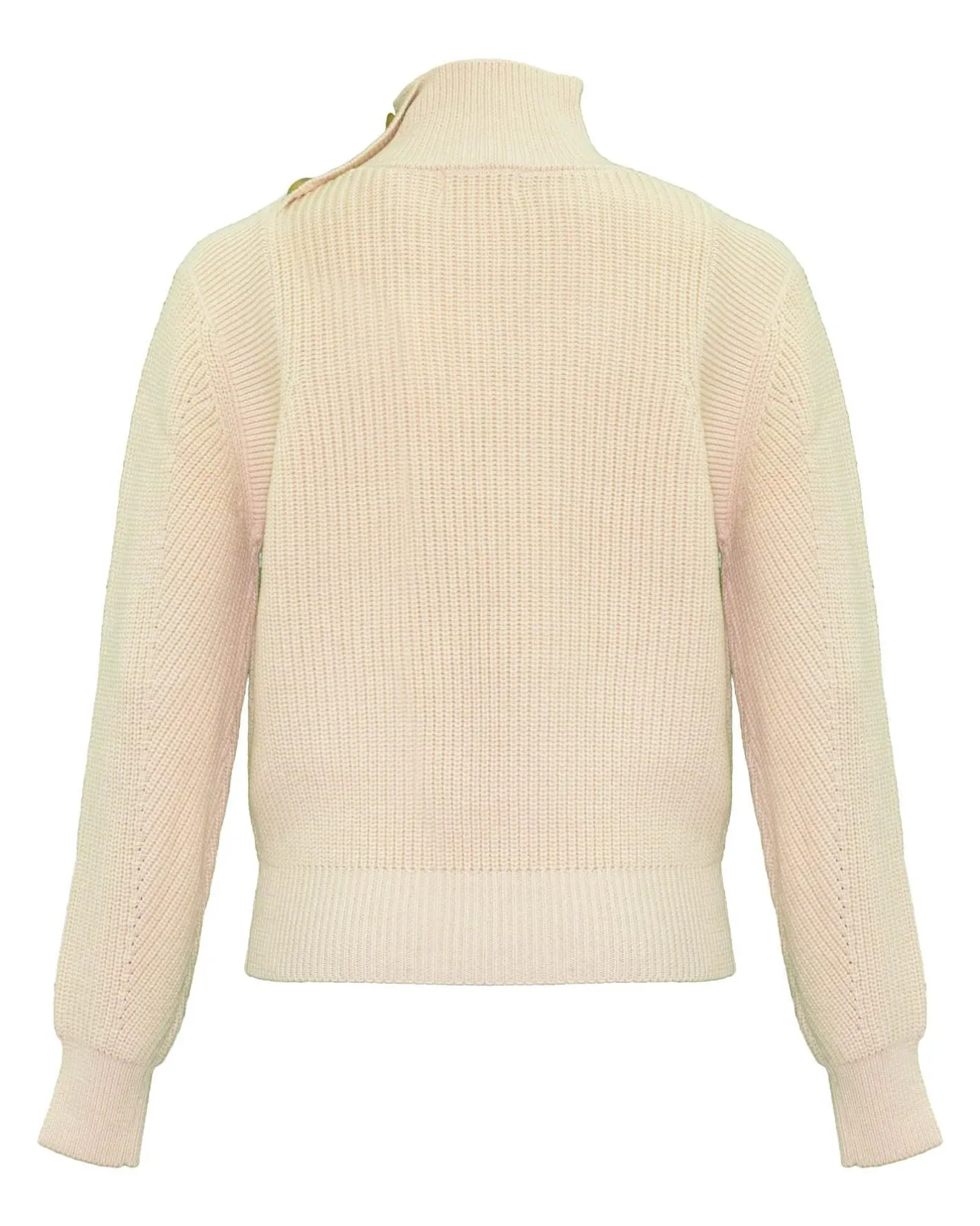 Long sleeve high neck knit pullover with decorative button placket from neck to shoulder