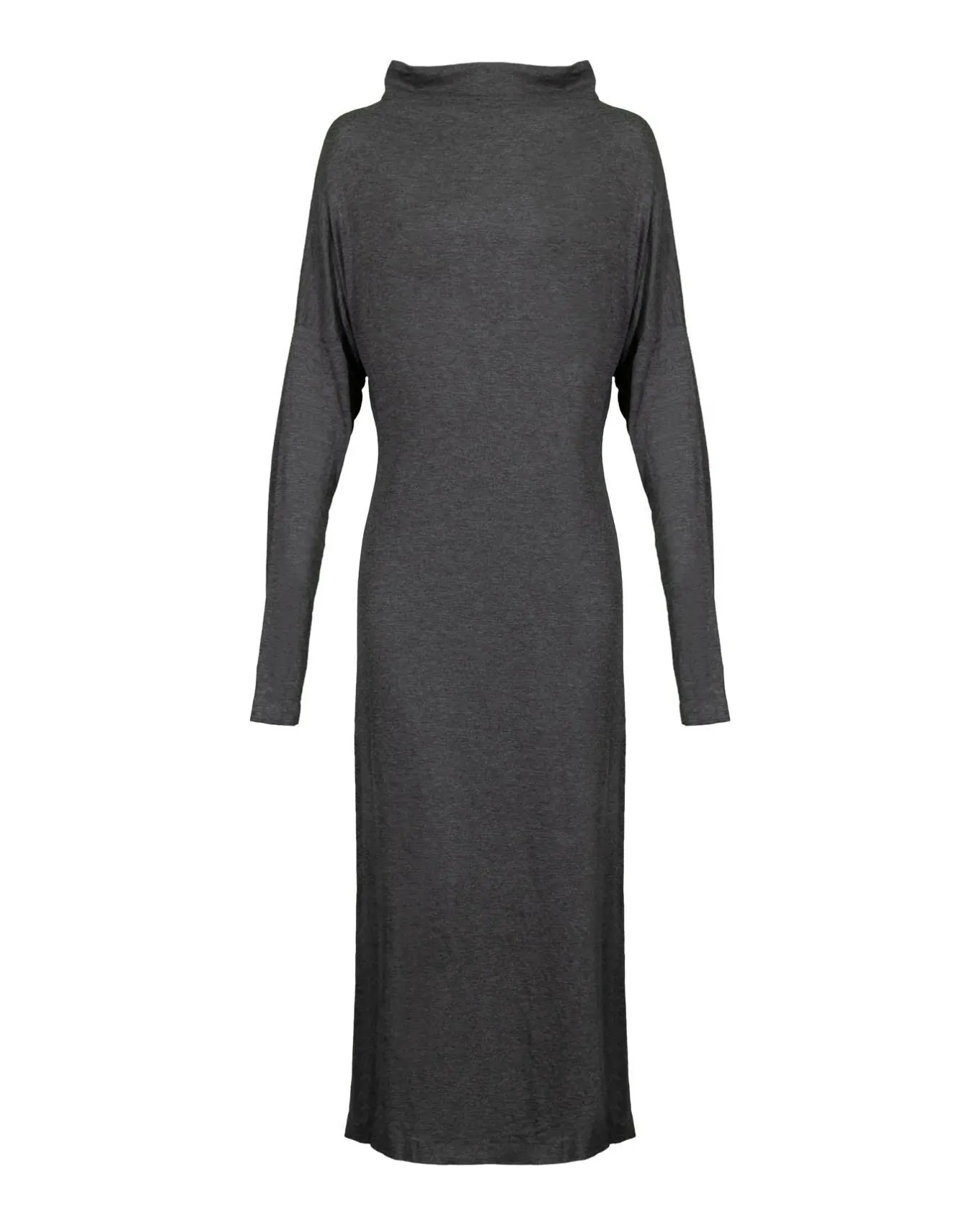 Pullover midcalf length dress features a convertible neckline for variety in wear designs. The wide neckline allows the piece to be worn as a strapless dress or relaxed skirt. The long dolman sleeves can be converted to a sash, shoulder straps, or self-belt