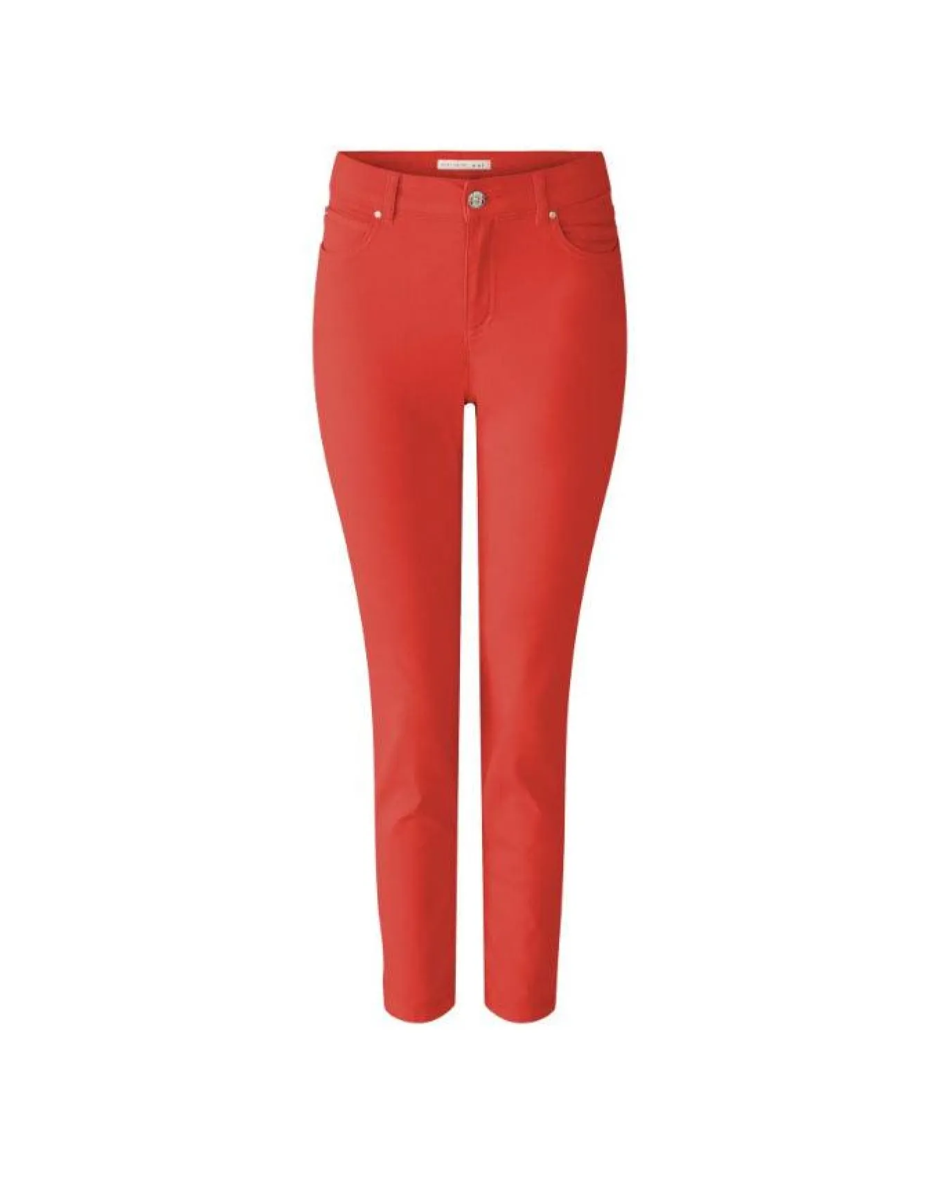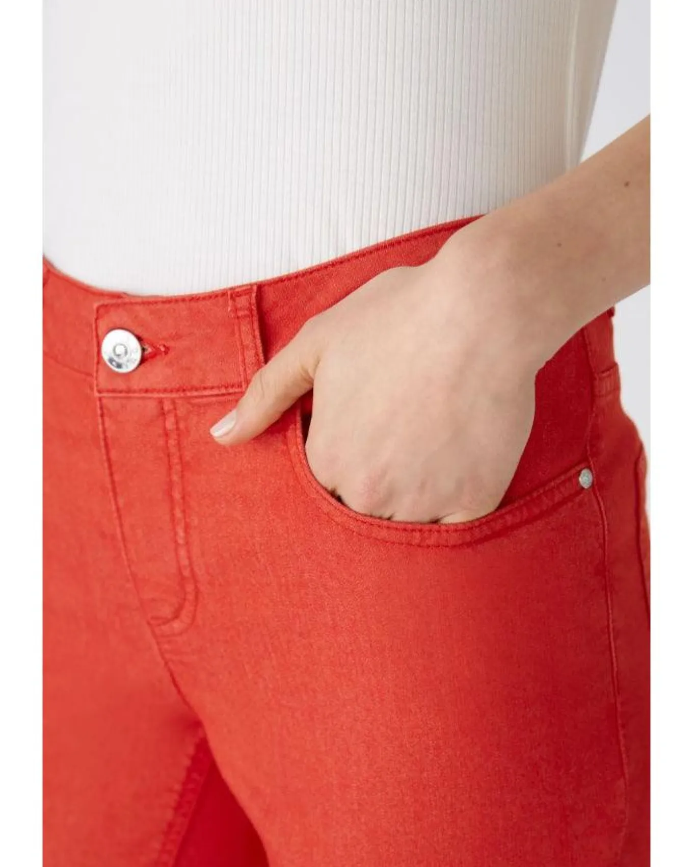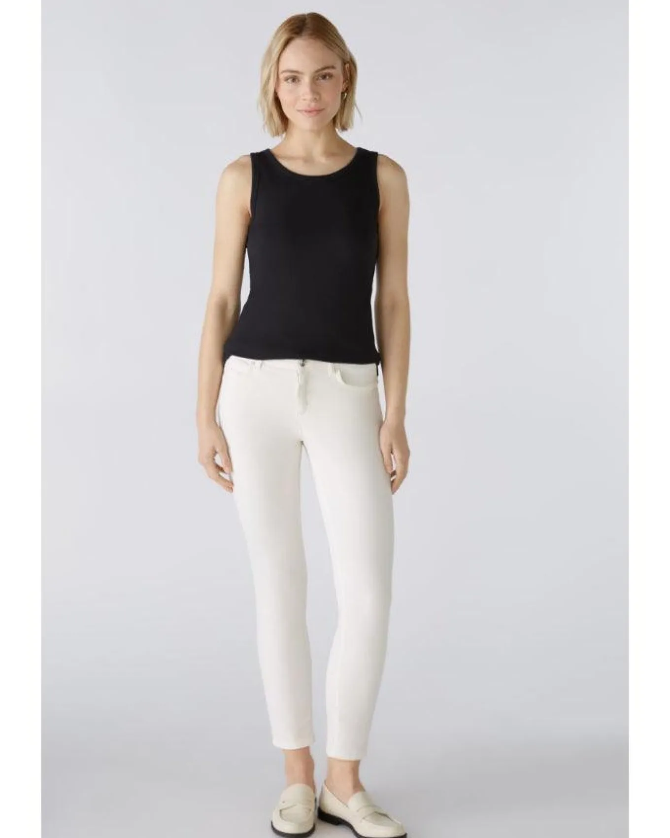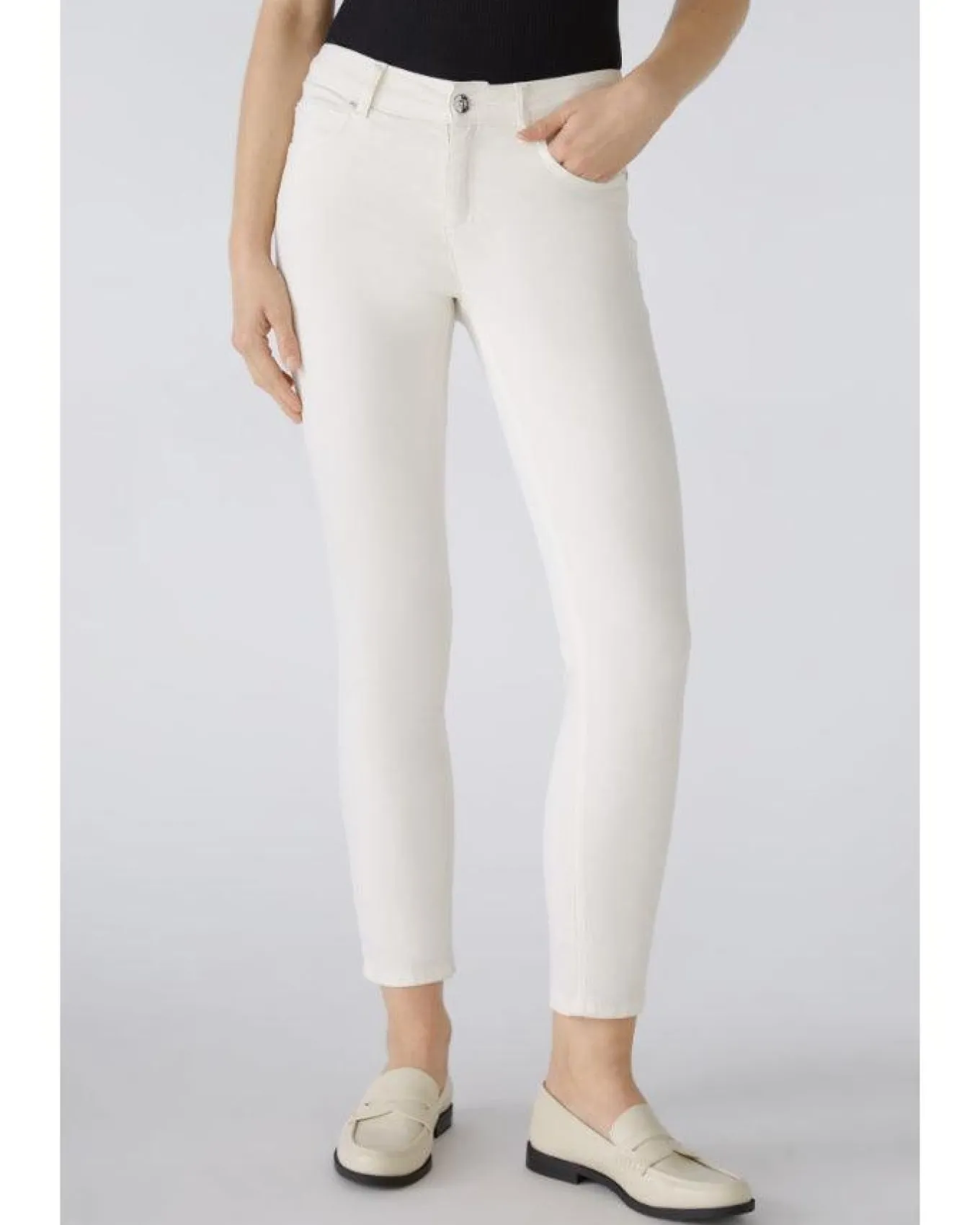 Oui fitted stretch cotton jeggings with classic five pocket styling, cropped length 72cm, button and zip closure.