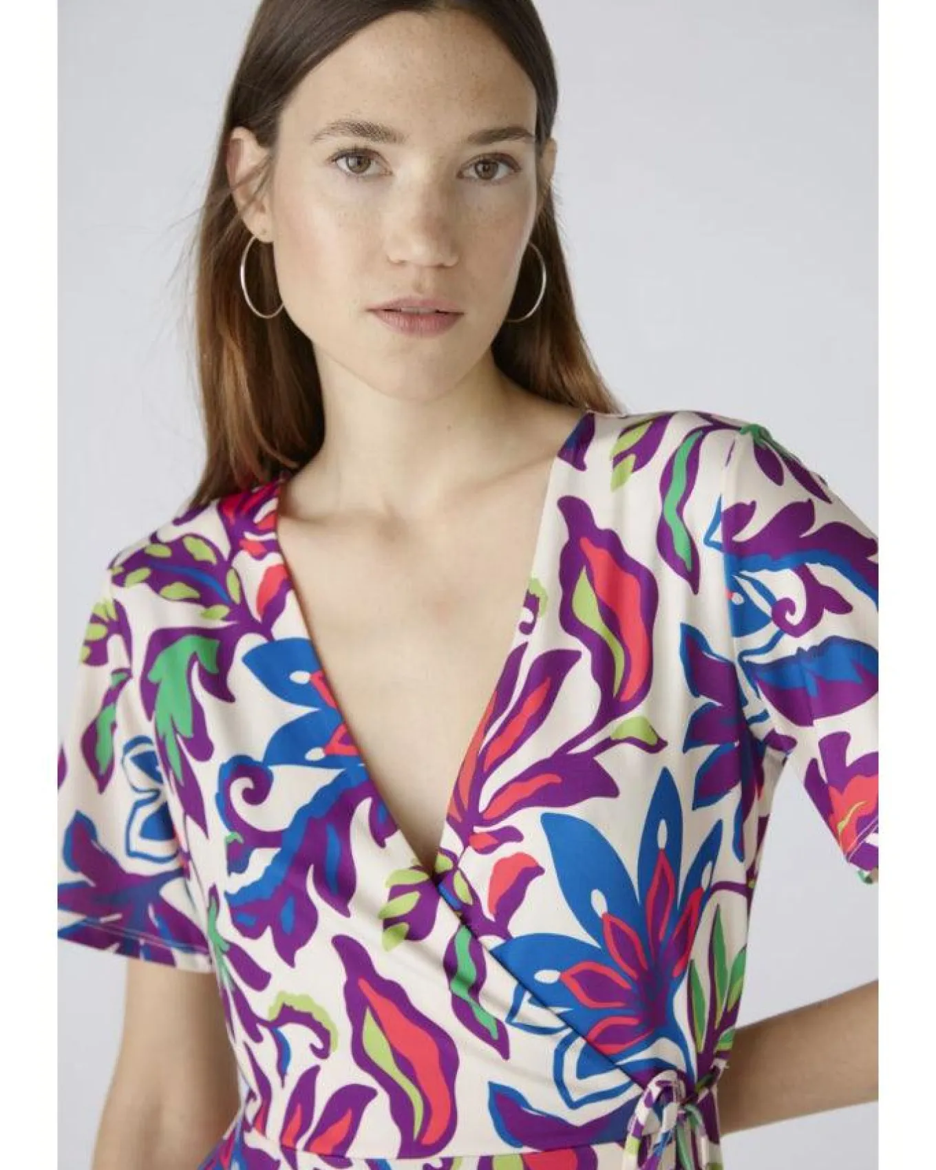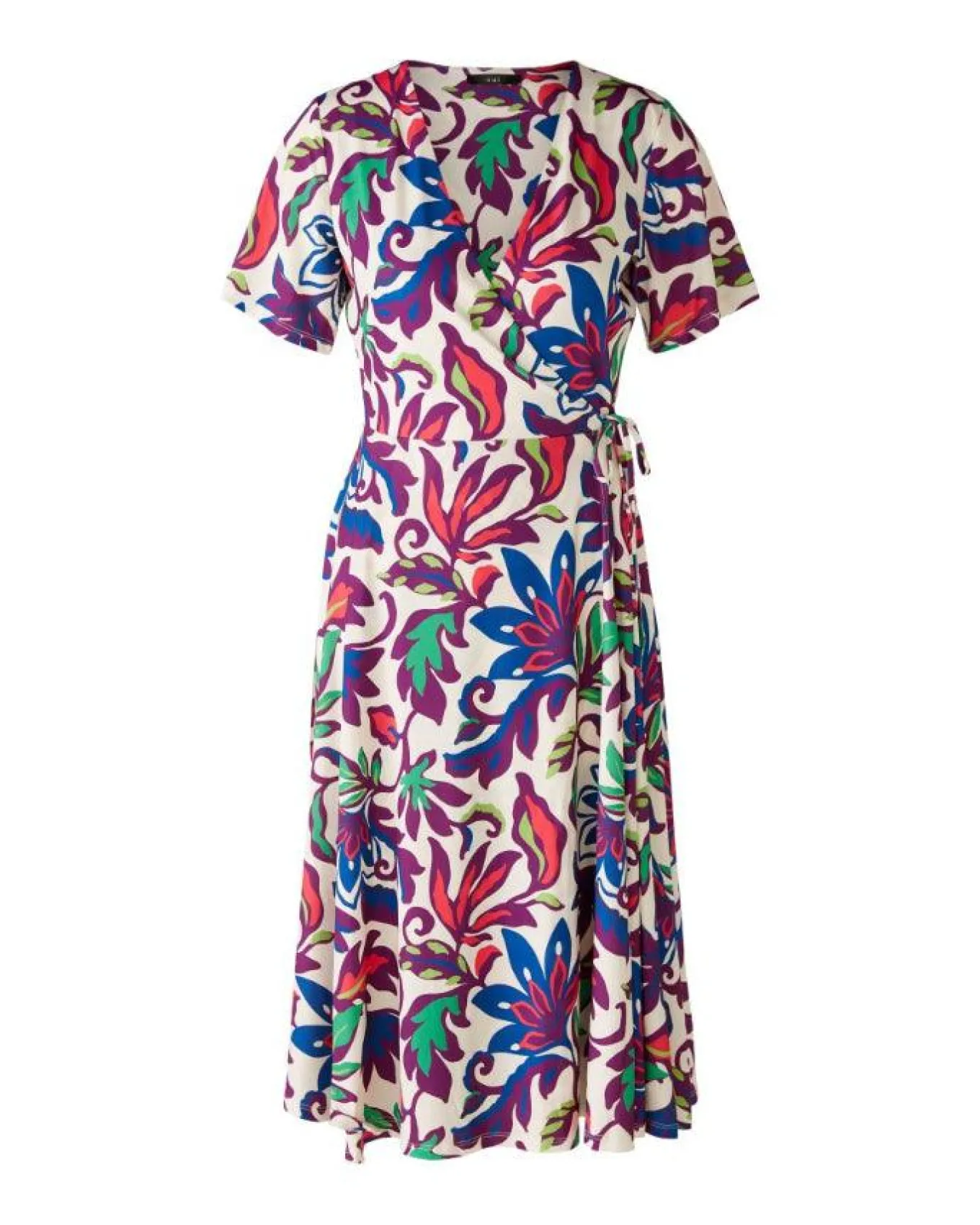 Oui silky touch floral print v-neck dress with short sleeves, faux wrap style with side tie to cinch waist, Length 108cm.