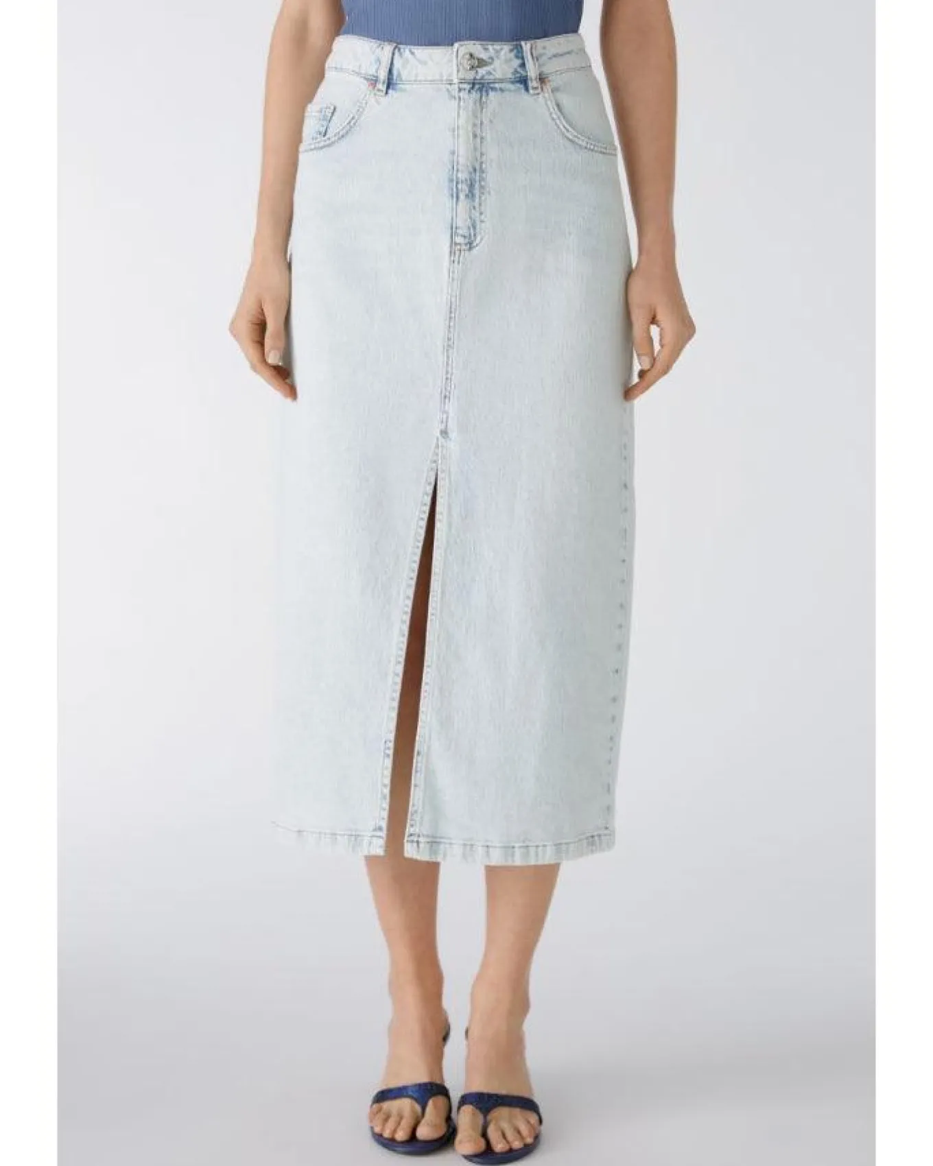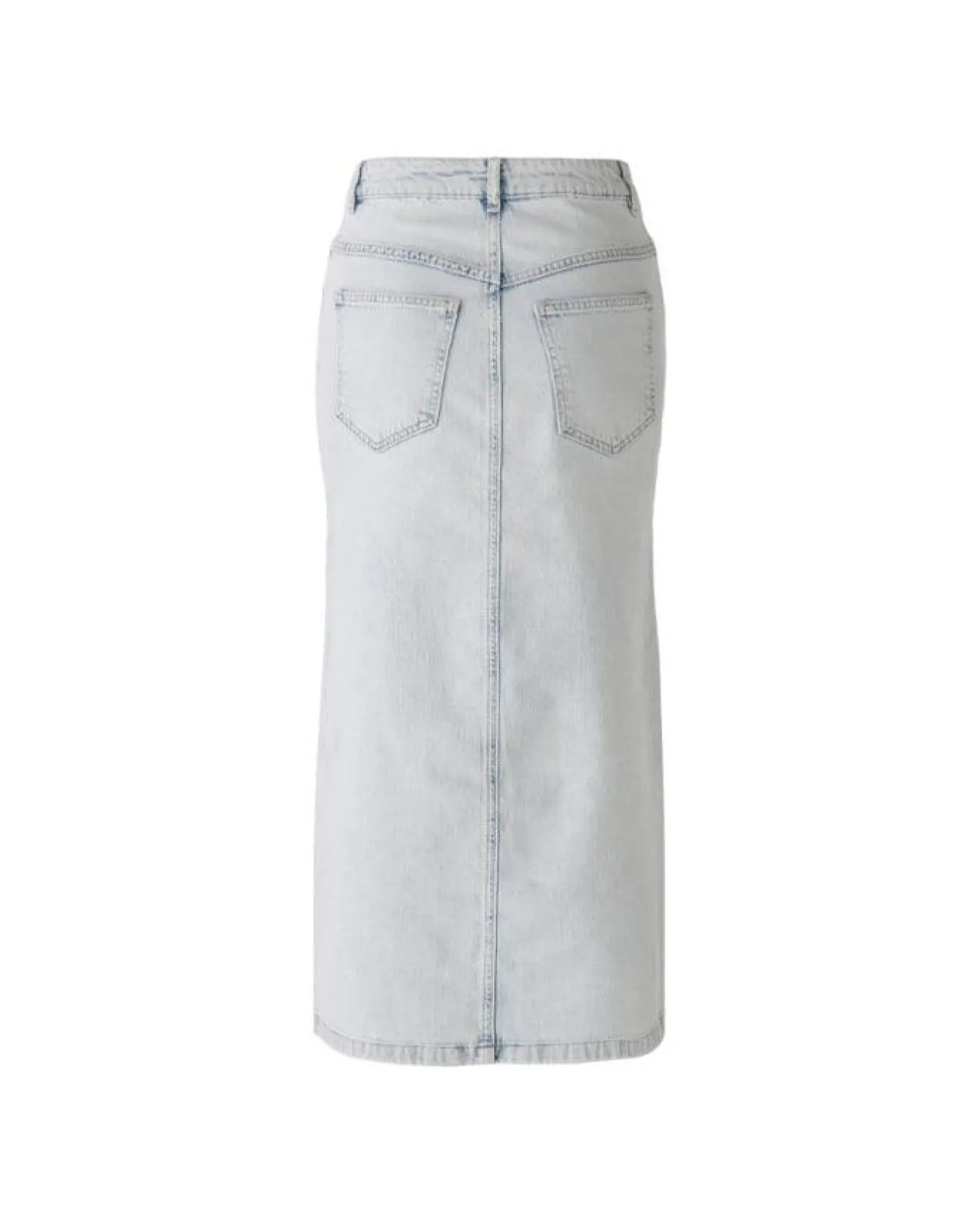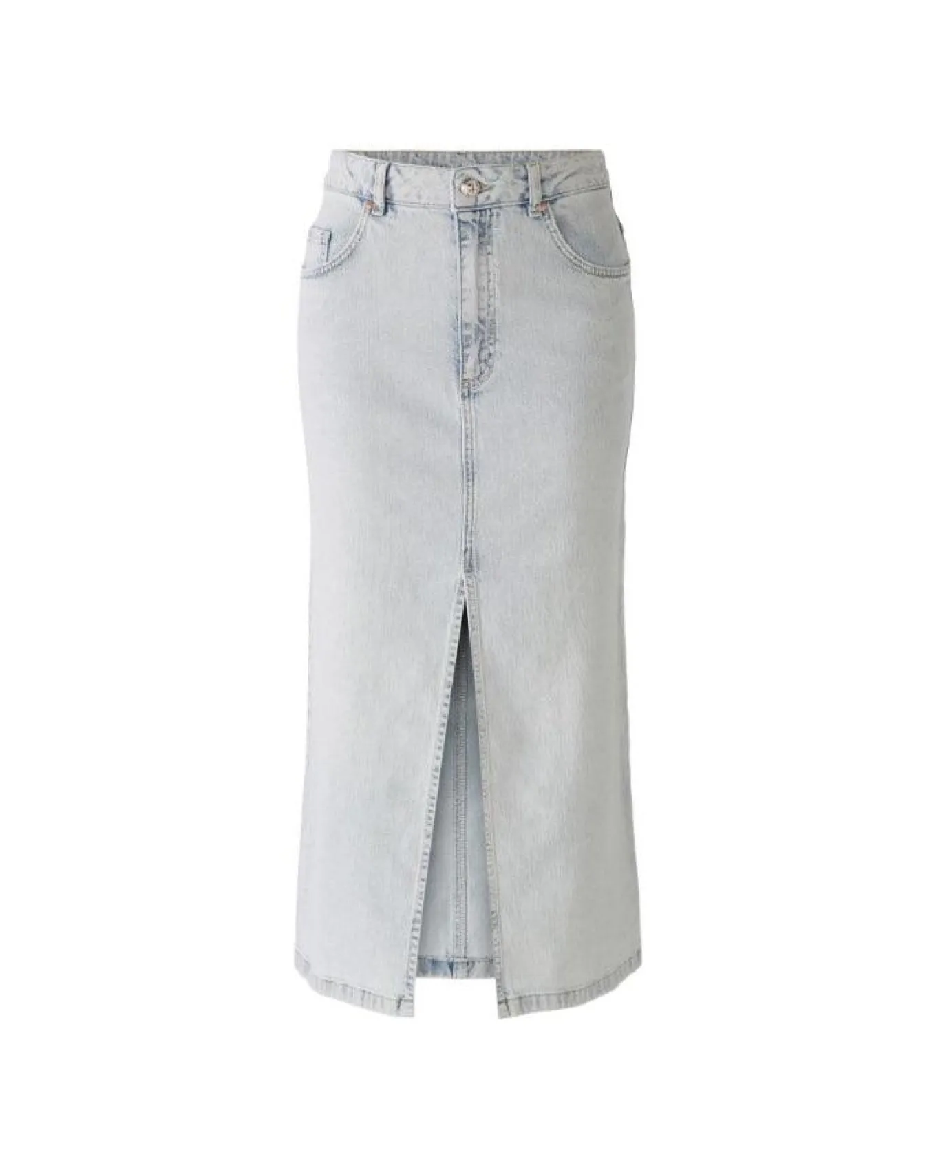 Oui maxi denim skirt with mid waist, long front slit, front and back pockets, button and zip closure, Length 88cm.