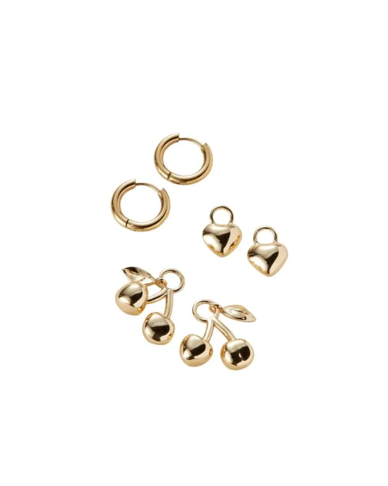 Jenny Bird playful, versatility of this earring kit by switching between Puffy Hearts and Cherry charms, which can be removed from a set of huggies. Remove charms for a set of water-durable, stainless steel huggies, finished in high-polish gold. Length: Huggie: 0.54″, Cherry: .08″, Heart: 0.52″