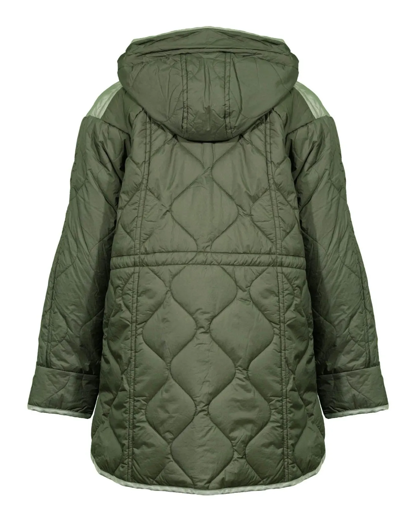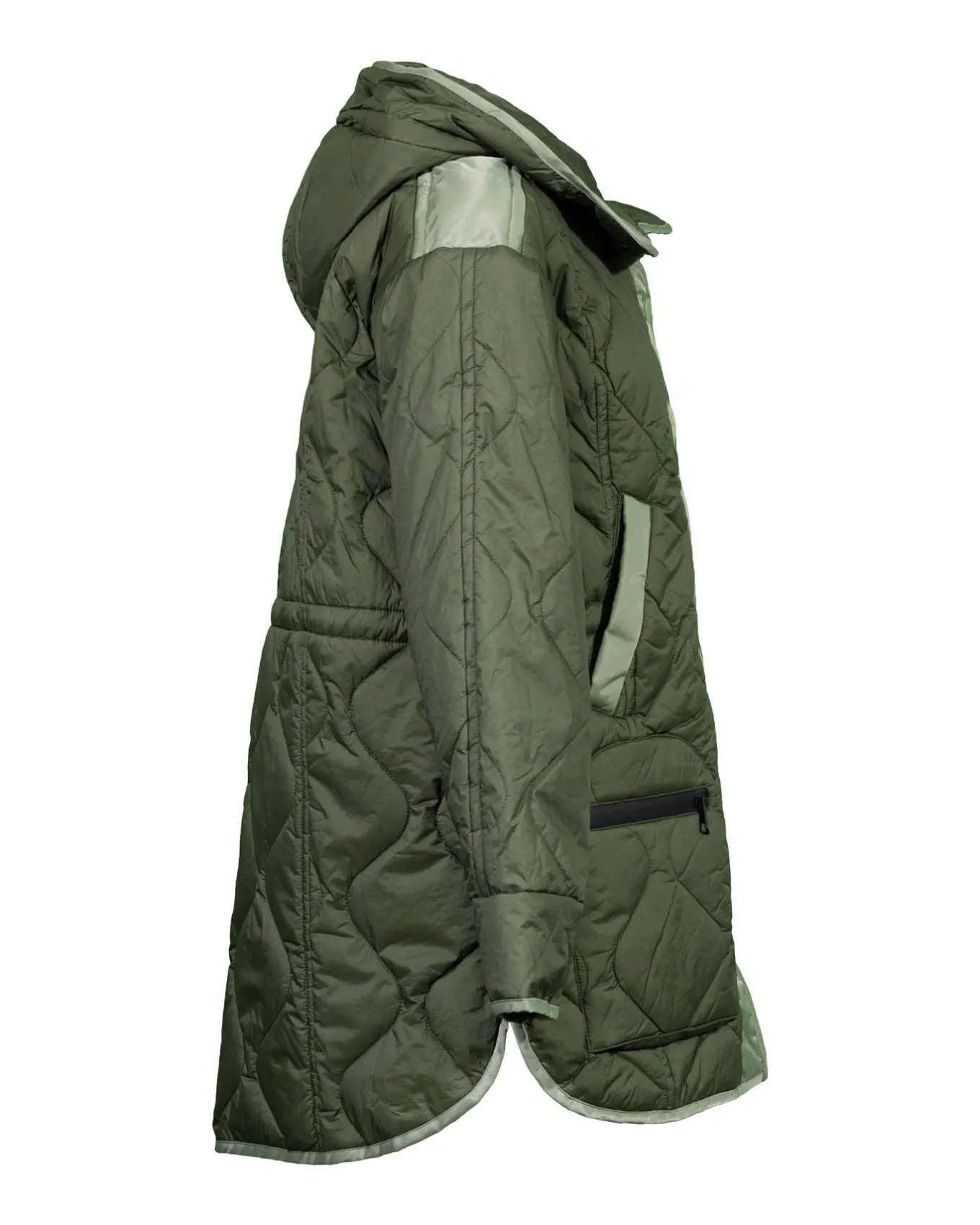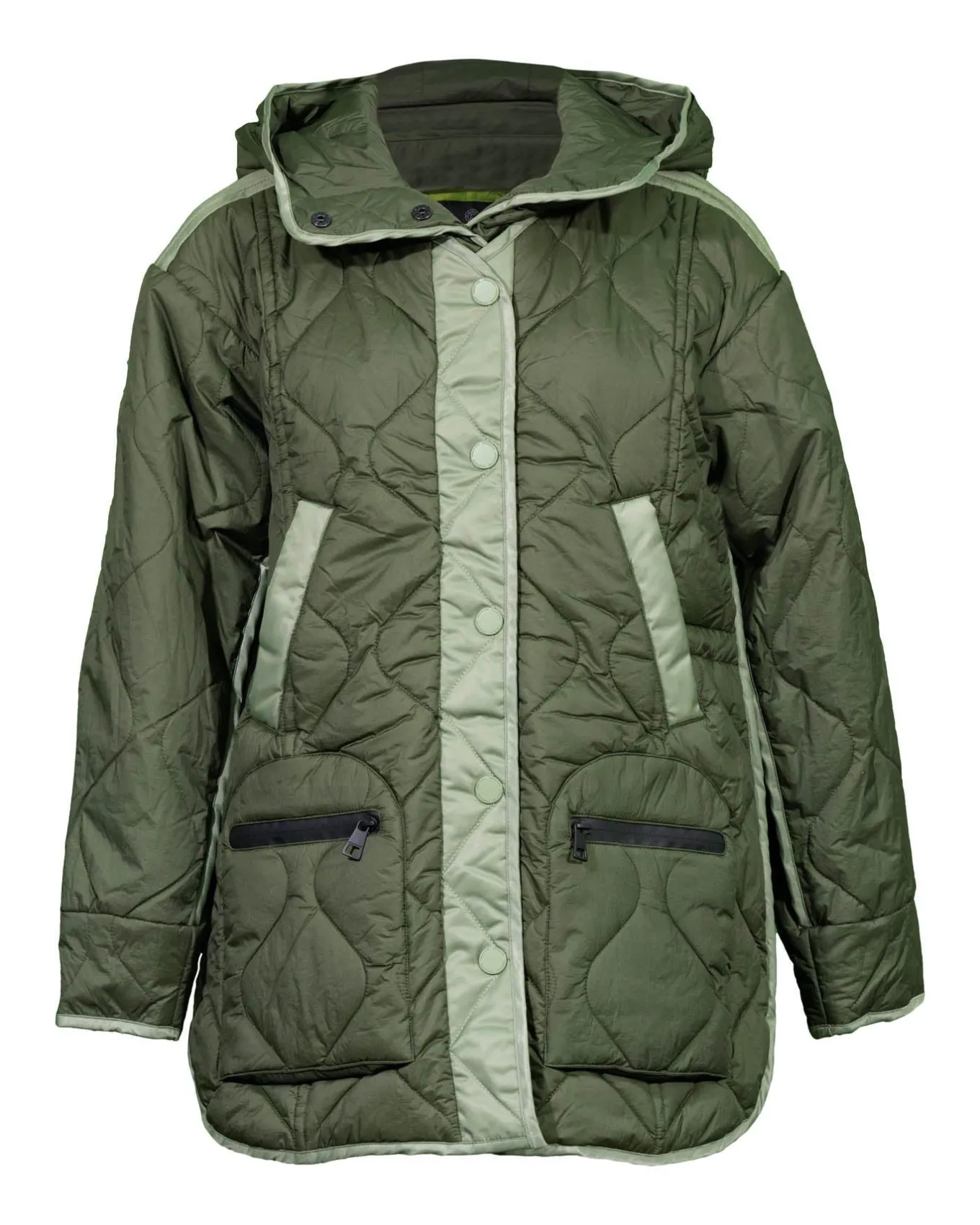 Relaxed fit lightweight onion quilted shirt style coat features detachable hood with adjustable cord, adjustable cord in waist, drop shoulders,patch pockets with waterproof zippers as well as soft fleece lined pockets on front, contrast trims, round hem with longer back, Size 38 – 84 cm long