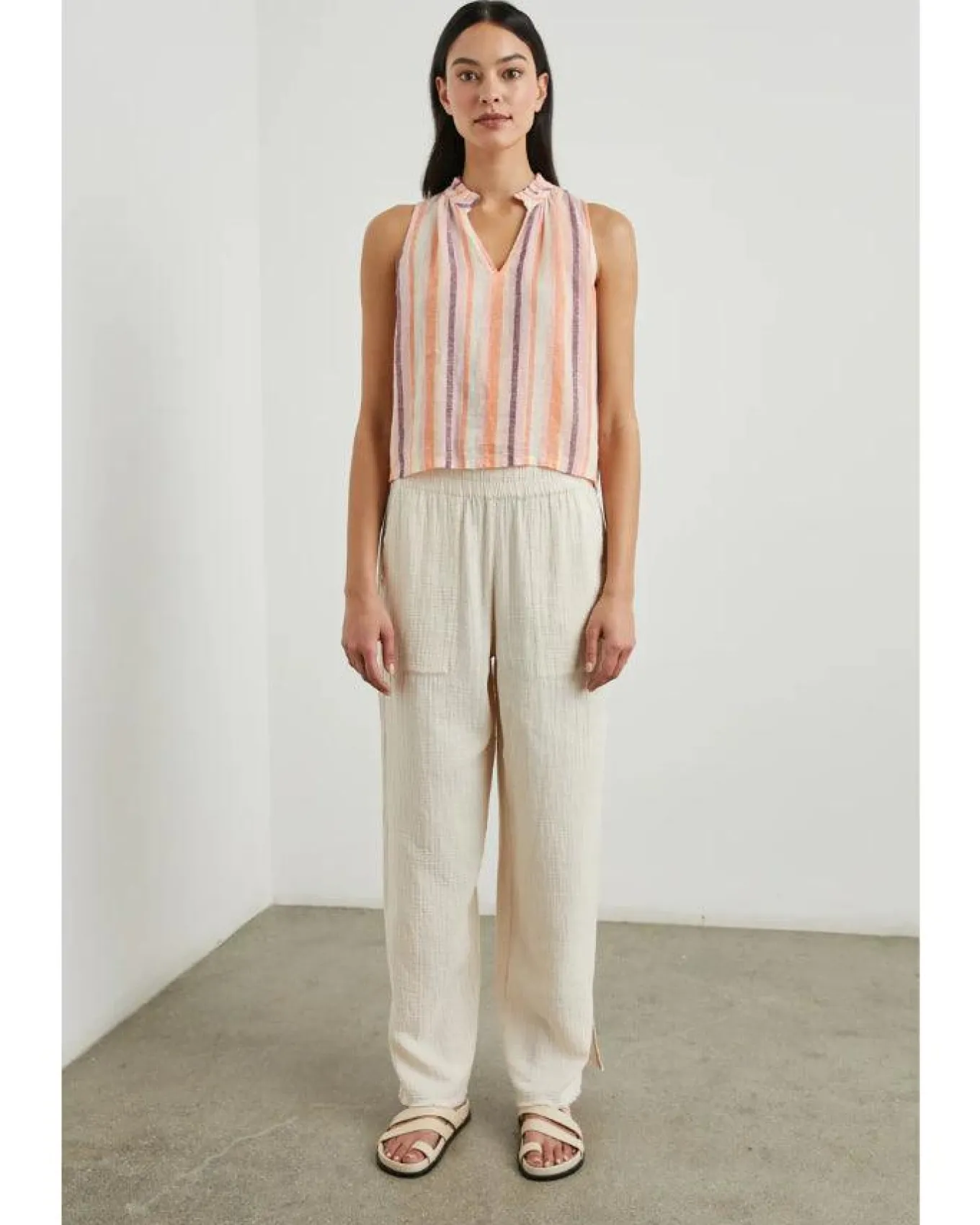 Rails airy luxe linen striped cropped top features split v-neck with ruffle neck detail, Size S – Length 22″.