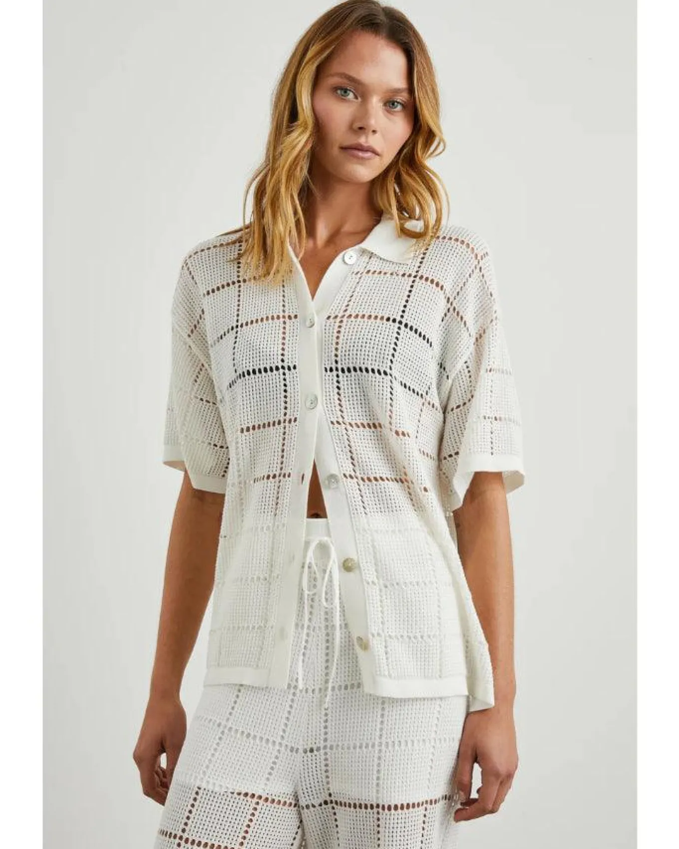 Rails boxy fit, super soft organic cotton blend top in an open-stitch grid design with button down front, classic collar and short sleeves. Size S – Length 24″.