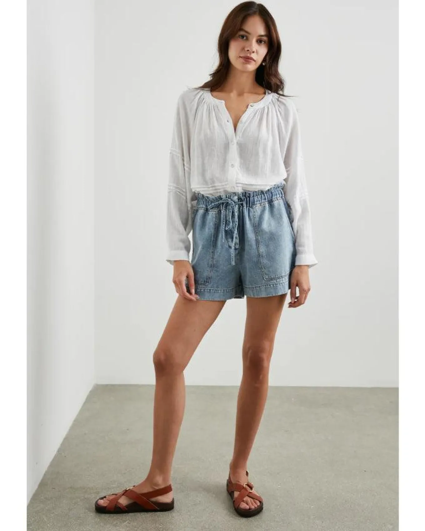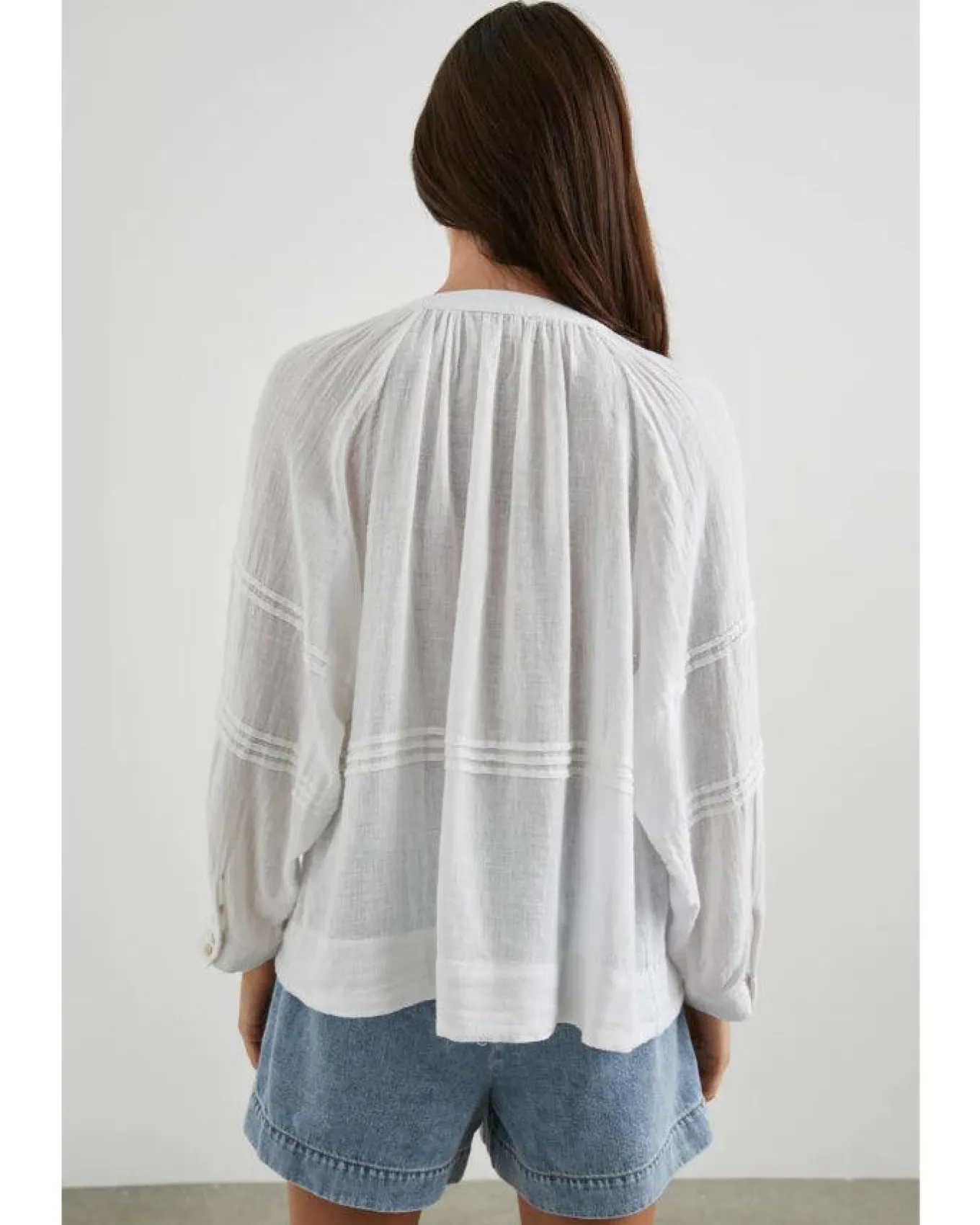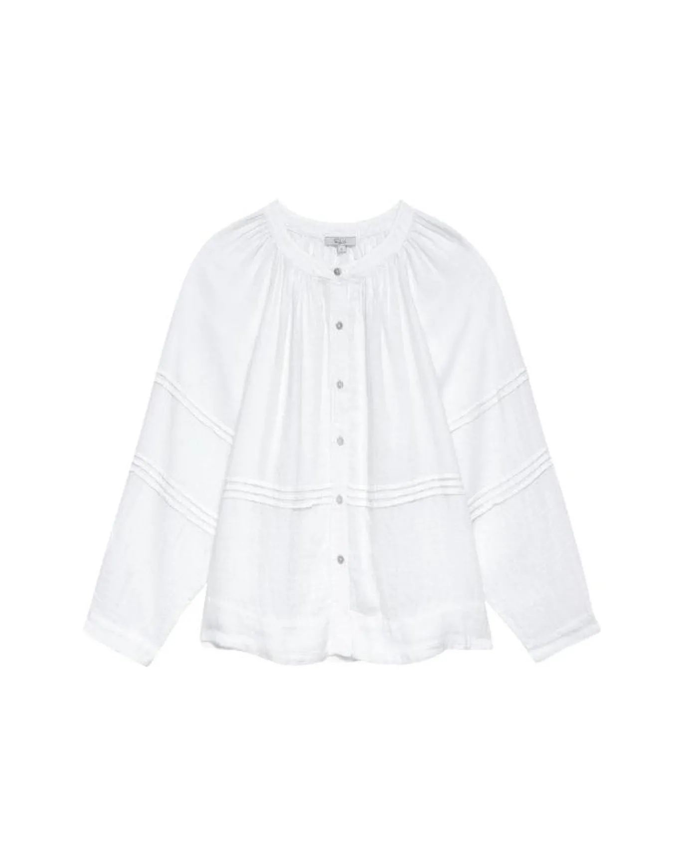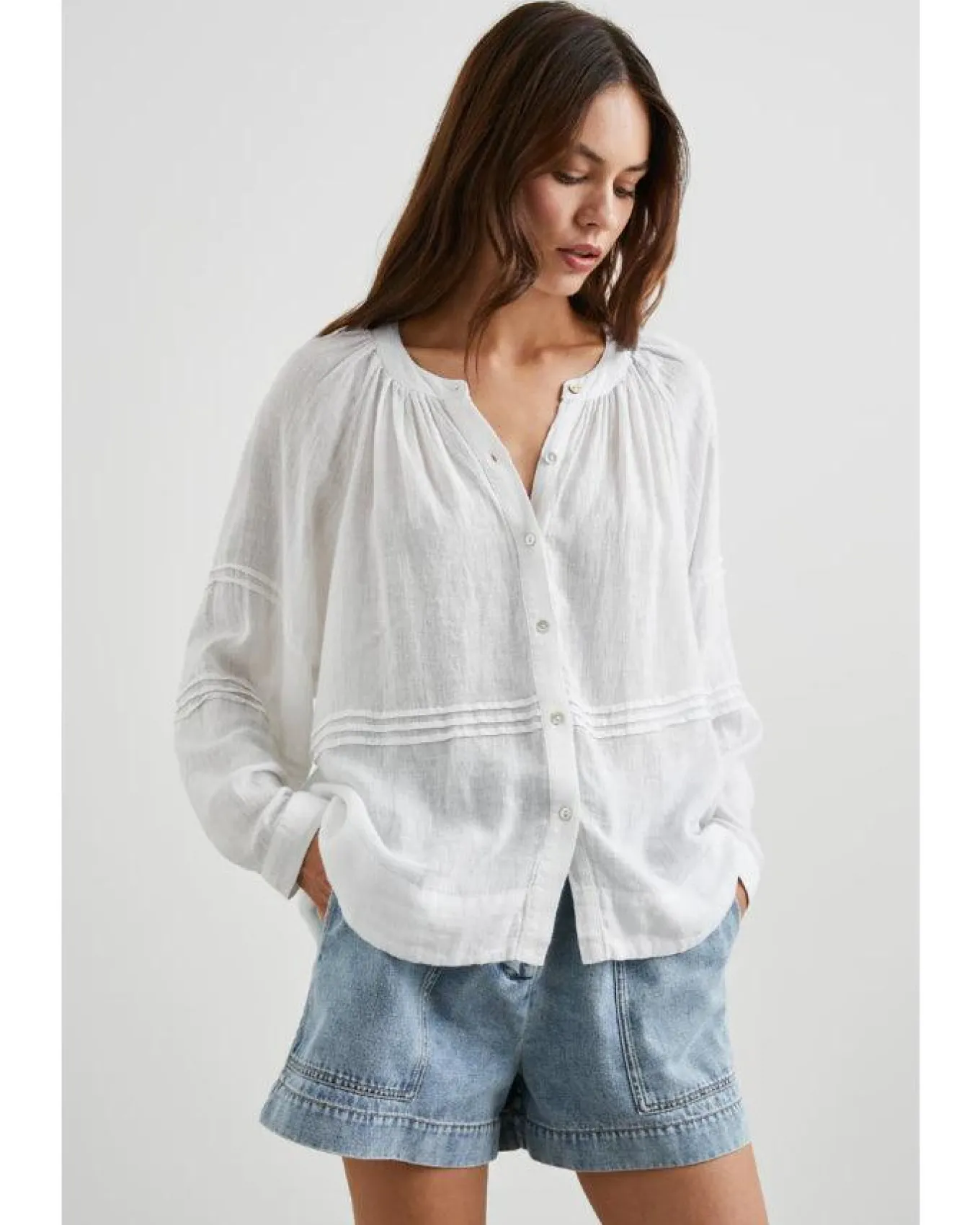 Rails relaxed fit luxe linen button down blouse features flattering pleating details, round neck and full length relaxed sleeves, Size S – Length 23 1/2″