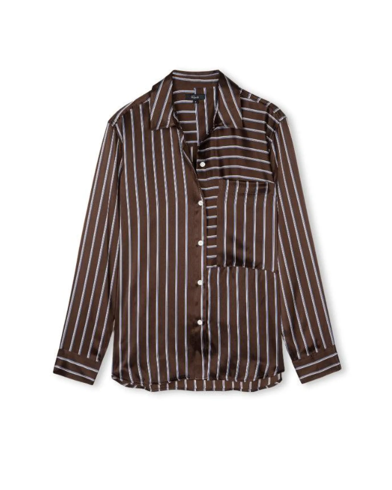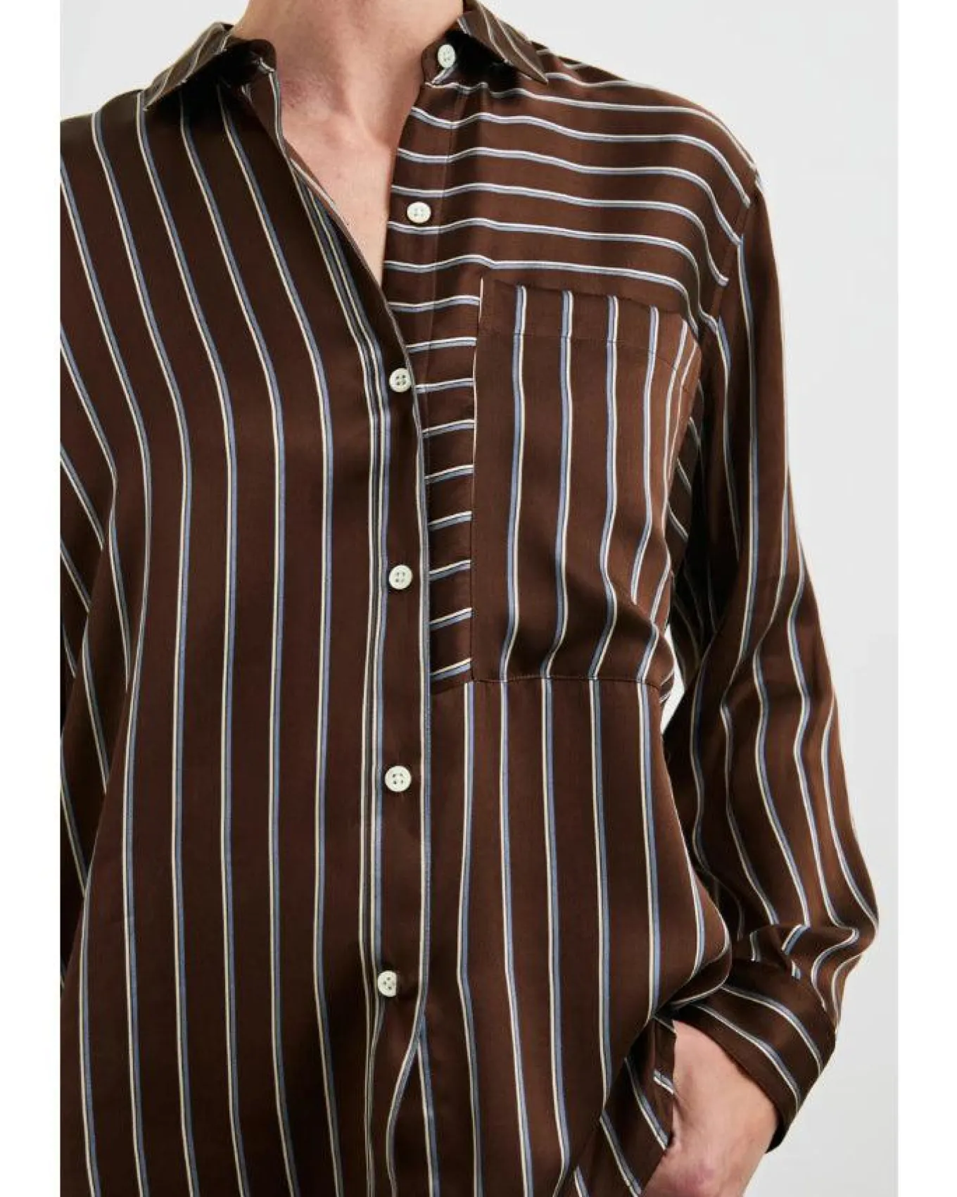 Rails relaxed fit luxe super smooth silk charmeuse button down shirt with vertical stripes, oversized patch pocket at chest and longer length, Size S – Length: 27″.