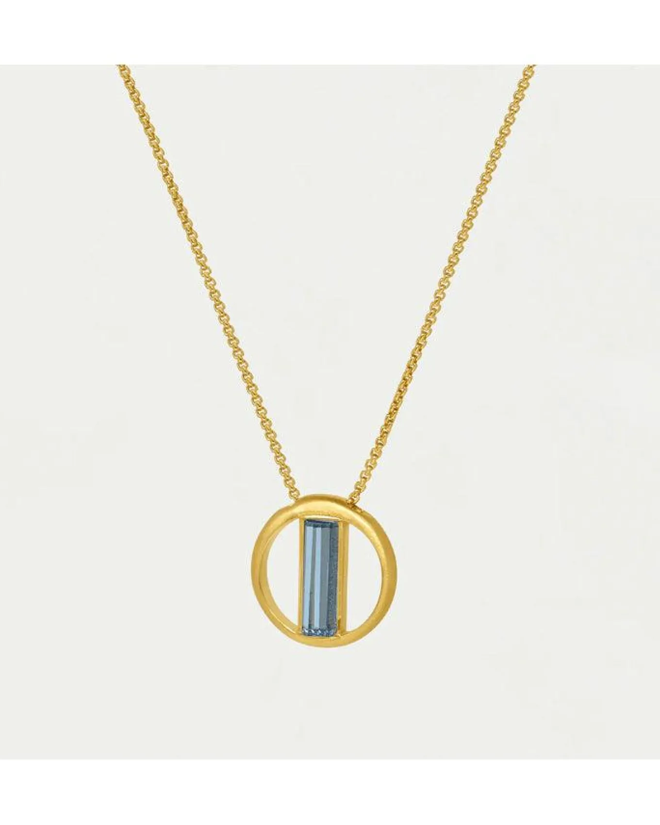 Revival barrel cut man made gemstone floats within golden circle suspended from a adjustable box chain, 22-Karat Gold over high quality brass, Length 20″