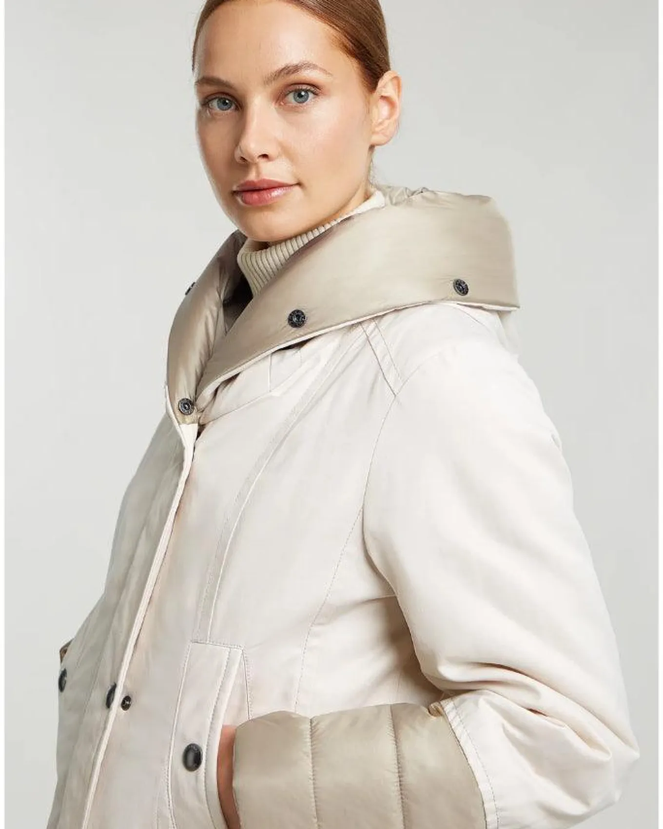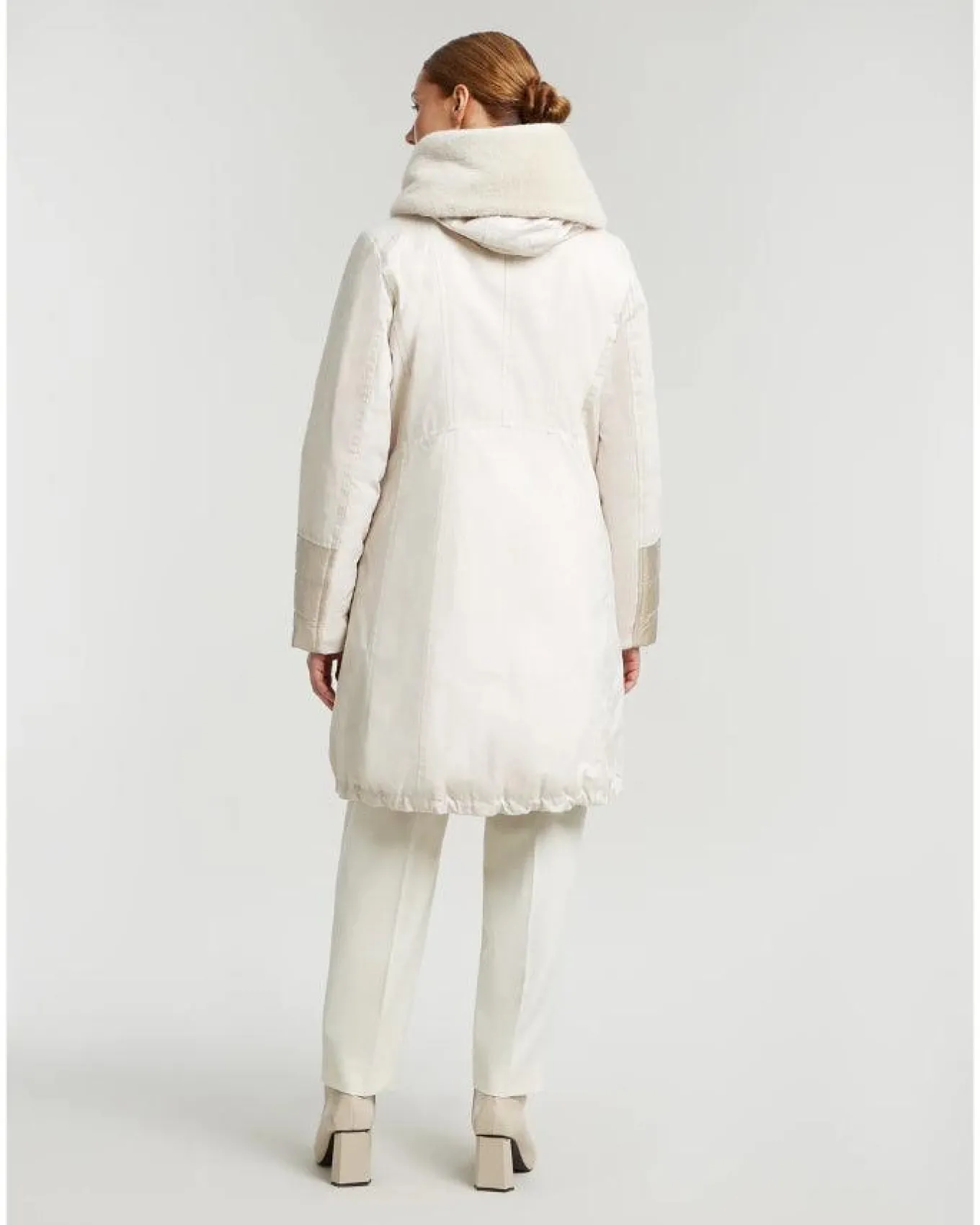 Creenstone elegant shaped wax coat features shawl collar with quilted inside, detachable faux fur inside hood edge, quilted cuff details in contrast fabric, front pockets with press buttons, knitted cuffs, cord tunnel at bottom hem, concealed 2-way metal look center front zipper and elegant back pleat, Length 95cm.