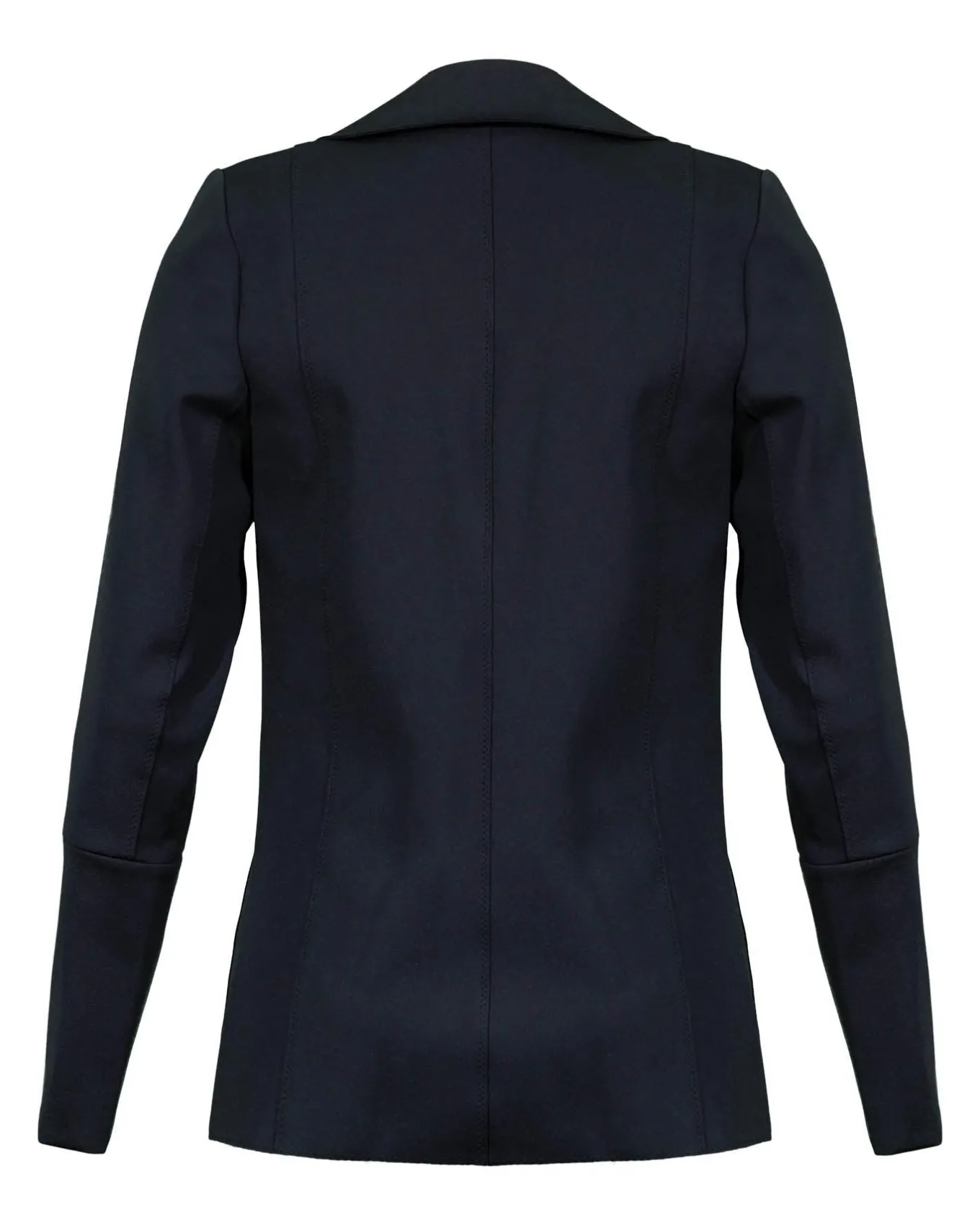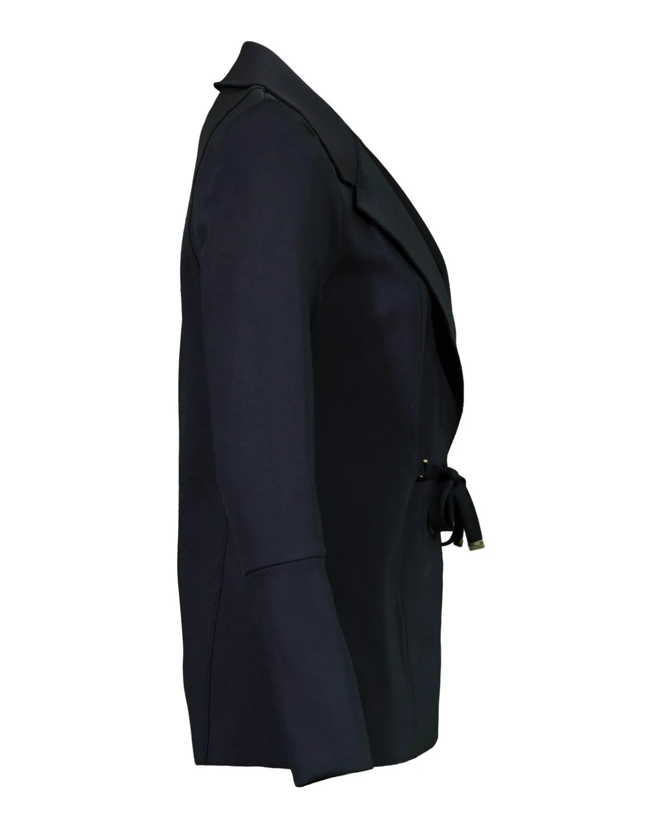 Shan structured soft and stretchy 3D jersey open front jacket with fastened string tie, notched lapel and longer sleeve cuffs. Length 27.5″