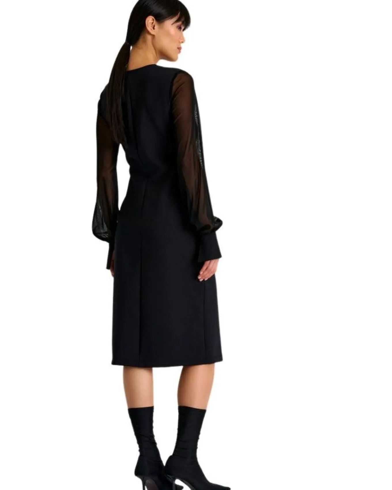 Shan Elegant, feminine, fitted sheer mesh long sleeve 3D jersey dress with v-neckline, long cuffs with slits, knee length